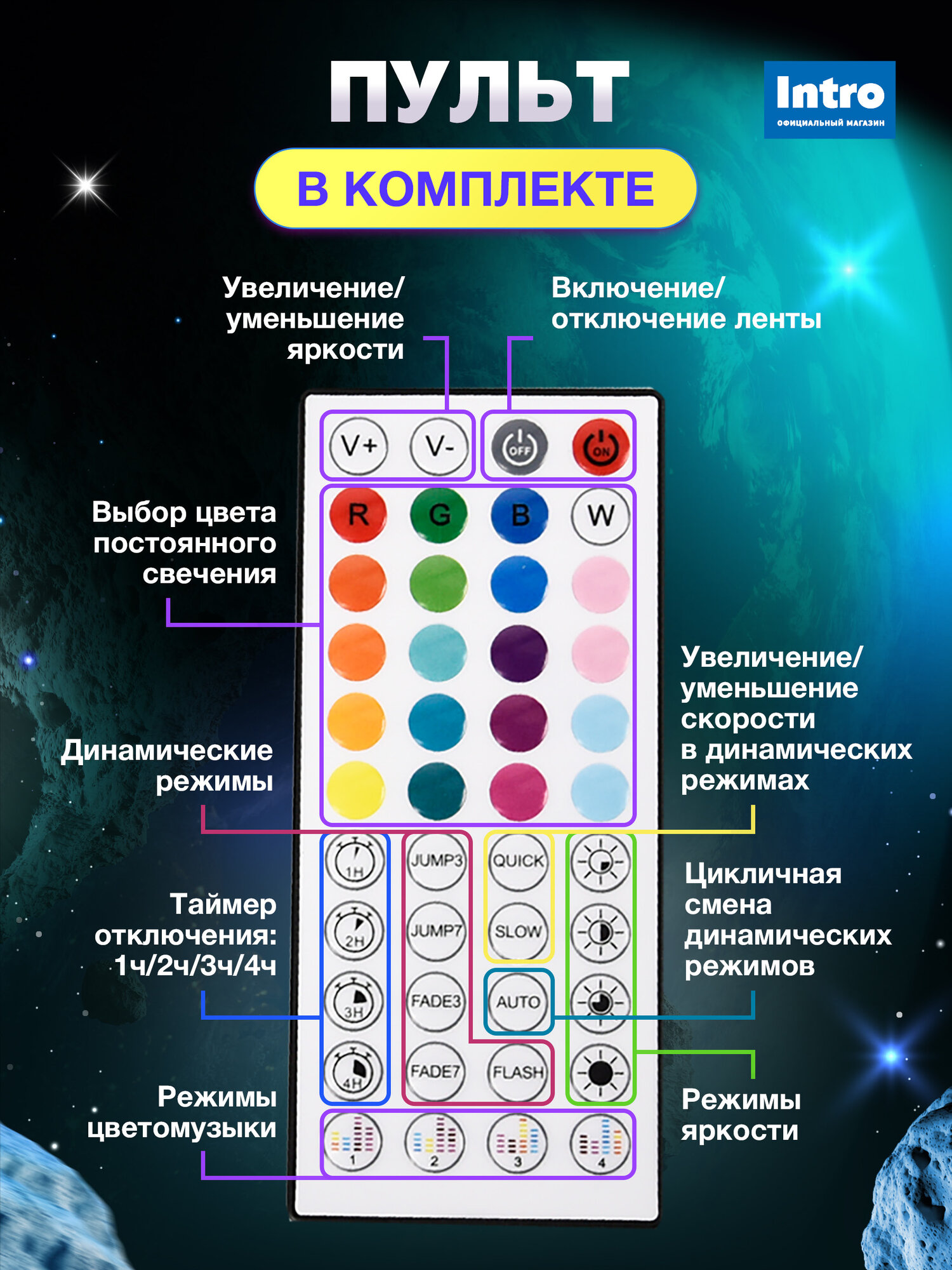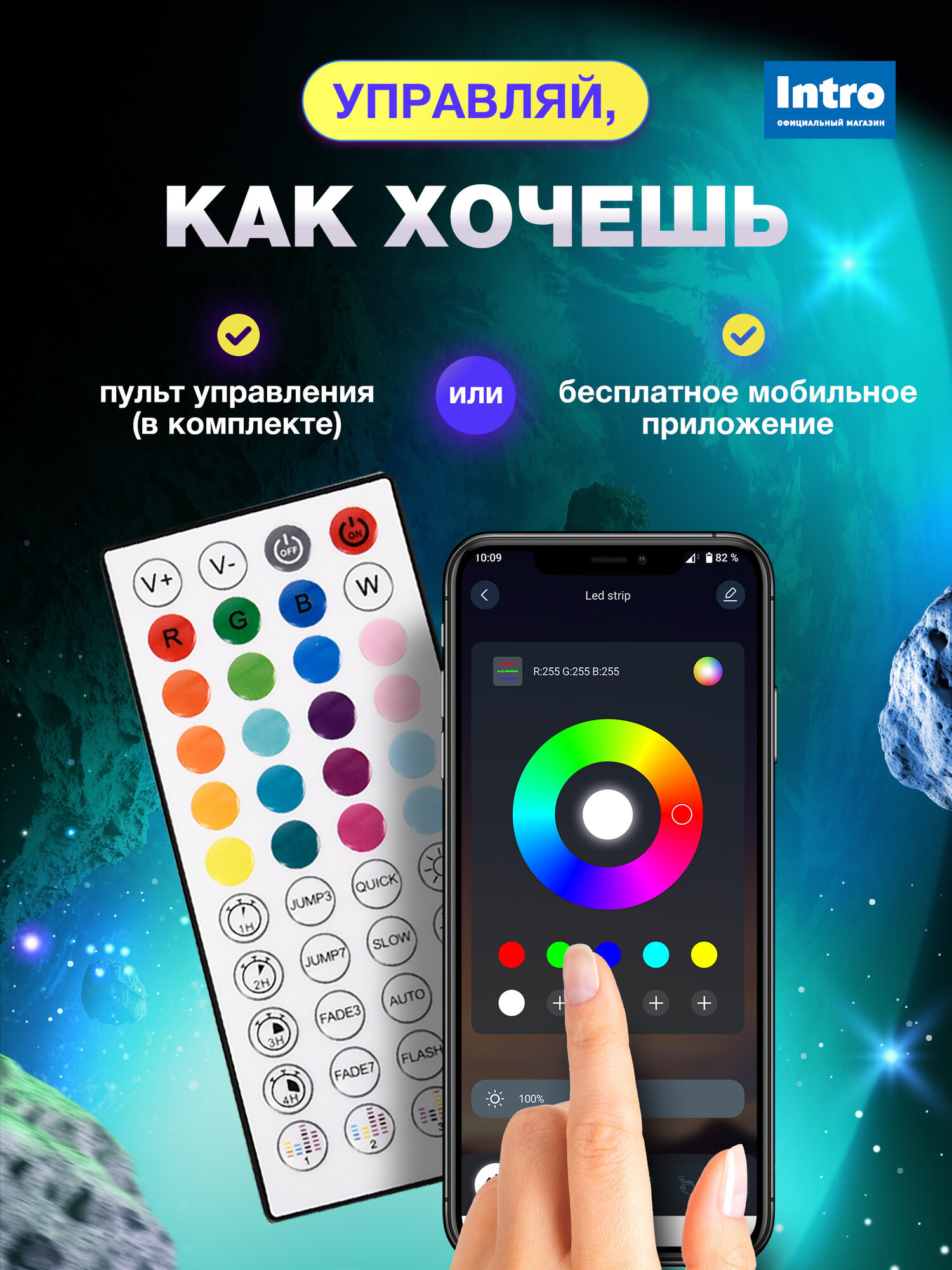 RGB-контроллер в комплекте, режим ночника, самоклеящаяся основа