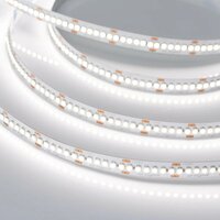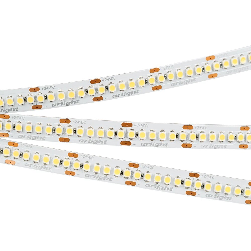 Светодиодная лента RT серии A240. Светодиоды SMD 3528, 240 шт/м, белая плата шириной 10 мм, скотч 3M. Цвет дневной 4000K, индекс цветопередачи CRI>90, угол 120°. Питание 24 В, мощность 19.2 Вт/м (96 Вт на 5 м). Размеры 5000x10x2 мм. Мин. отрезок 25 мм, 6 светодиодов. . Обязательная установка на профиль.