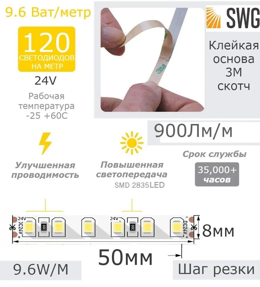 Светодиодная лента SWG 9.6Вт 24В представляет собой оригинальный низковольтный гибкий источник света, который может быть использован для основного освещения рабочих и жилых помещений, декоративной подсветки деталей интерьера, в световых рекламных вывесках и для воспроизведения свето- и цвето- динамических программ.