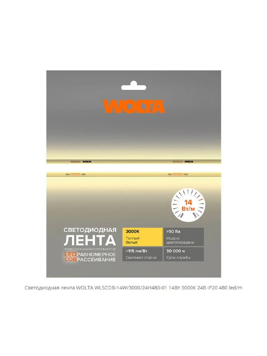 Светодиодная лента WOLTA WLSCOB-14W/3000/24H480-01 14Вт 3000К 24В IP20 480 led/m: сравнение цен, характеристики, фото, актуальное наличие и цены.