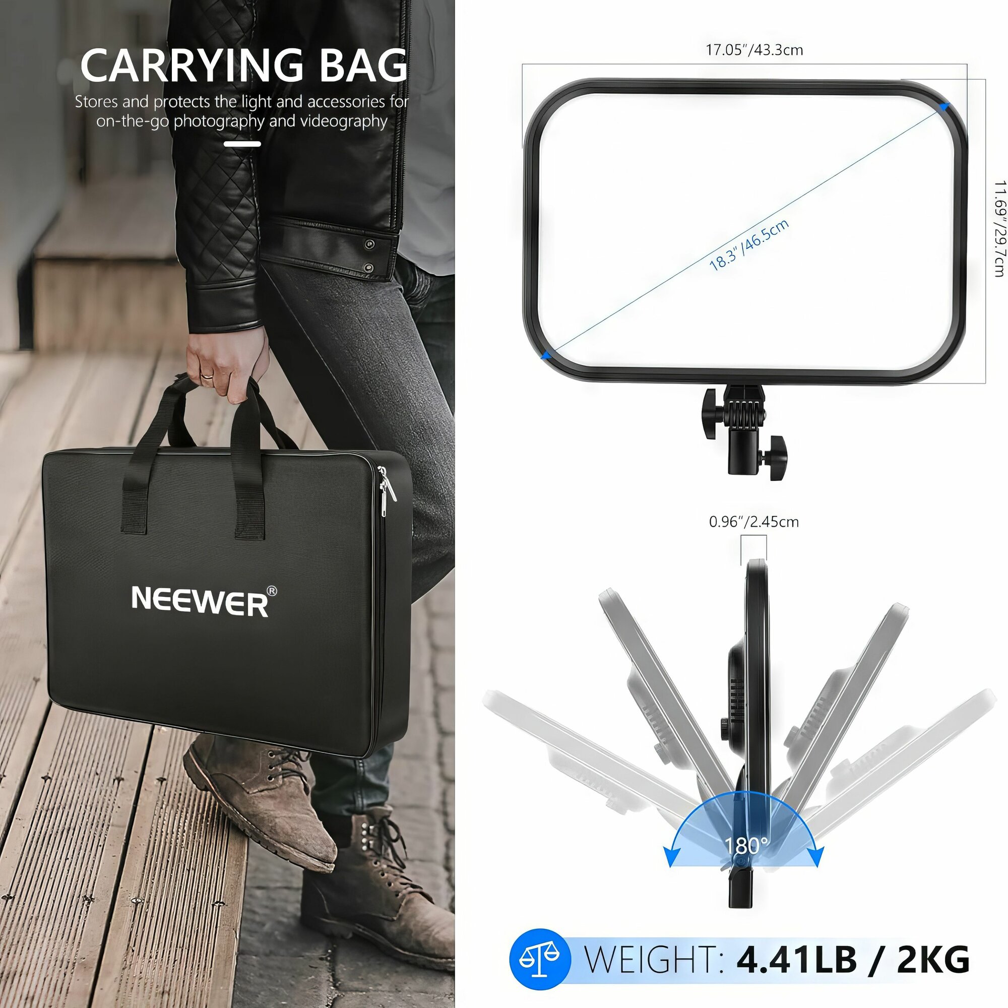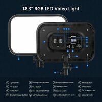 В осветителе 144 светодиода RGBWW, высокий CRI 97 + и TLCI 97+ для достижения точной цветопередачи. Регулировка цветного оттенка от 0 до 360 °, регулировка яркости от 0 до 100%, цветовая температура 2500K-8500K и 17 специальных световых эффектов, осветитель отлично подойдет для различных типов съемок, в частности для съемки видео YouTube TikTok, прямой трансляции игр, освещению видеоконференций, проведения профессиональных фото и видеосессий. Управление осуществляется через официальное мобильное приложение Neewer. Питание от прилагаемого адаптера питания постоянного тока 15 В 4,8 А или 2 шт NP-F батареек (не входят в комплект). Съемный монтажный кронштейн позволяет быстро установить светильник на штатив (не входит в комплект), а сумка для переноски хранит и защищает светильник при транспортировке.