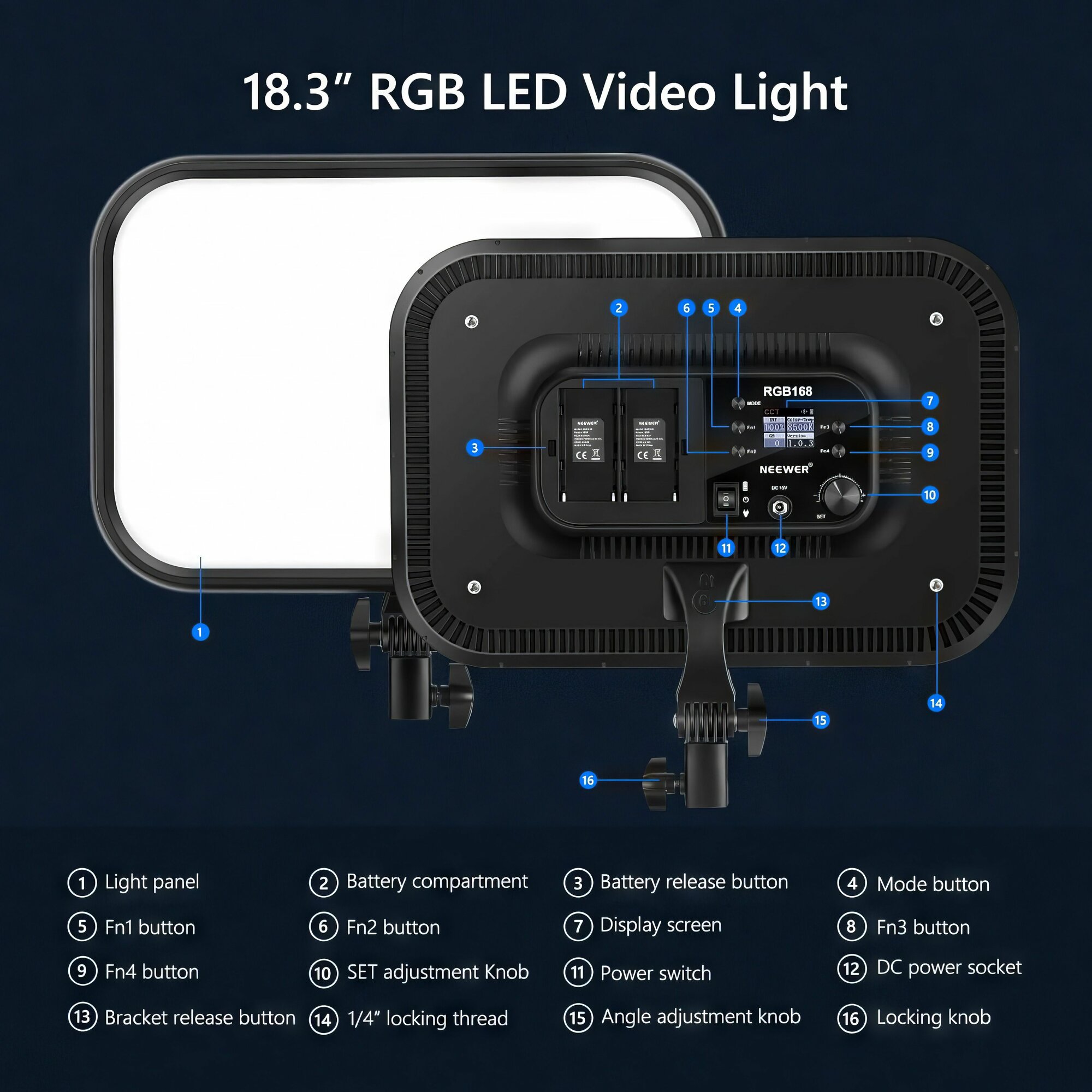 Технические характеристики: Модель: RGB168 Количество светодиодов: 144 светодиода RGBWW Максимальная мощность: 60 Вт Максимальная освещенность: (5600K) 5000 люкс на 0,5 м (5600K), 1500 люкс на 1 м CRI 97+ TLCI 97+ Регулировка яркости: 0 -100% Цветовая температура: 2500 К ~ 8500К Регулировка цветового оттенка: 0-360° Регулировка насыщенности цвета: 0~100% Рабочая температура: 0°C-35°C Источник питания: 2 съемных аккумулятора NP-F (в комплект не входит) или через адаптер питания постоянного тока 15 В 4.8 А Размеры: 43.3 × 29.7 × 2.45 см Вес:2 кг
