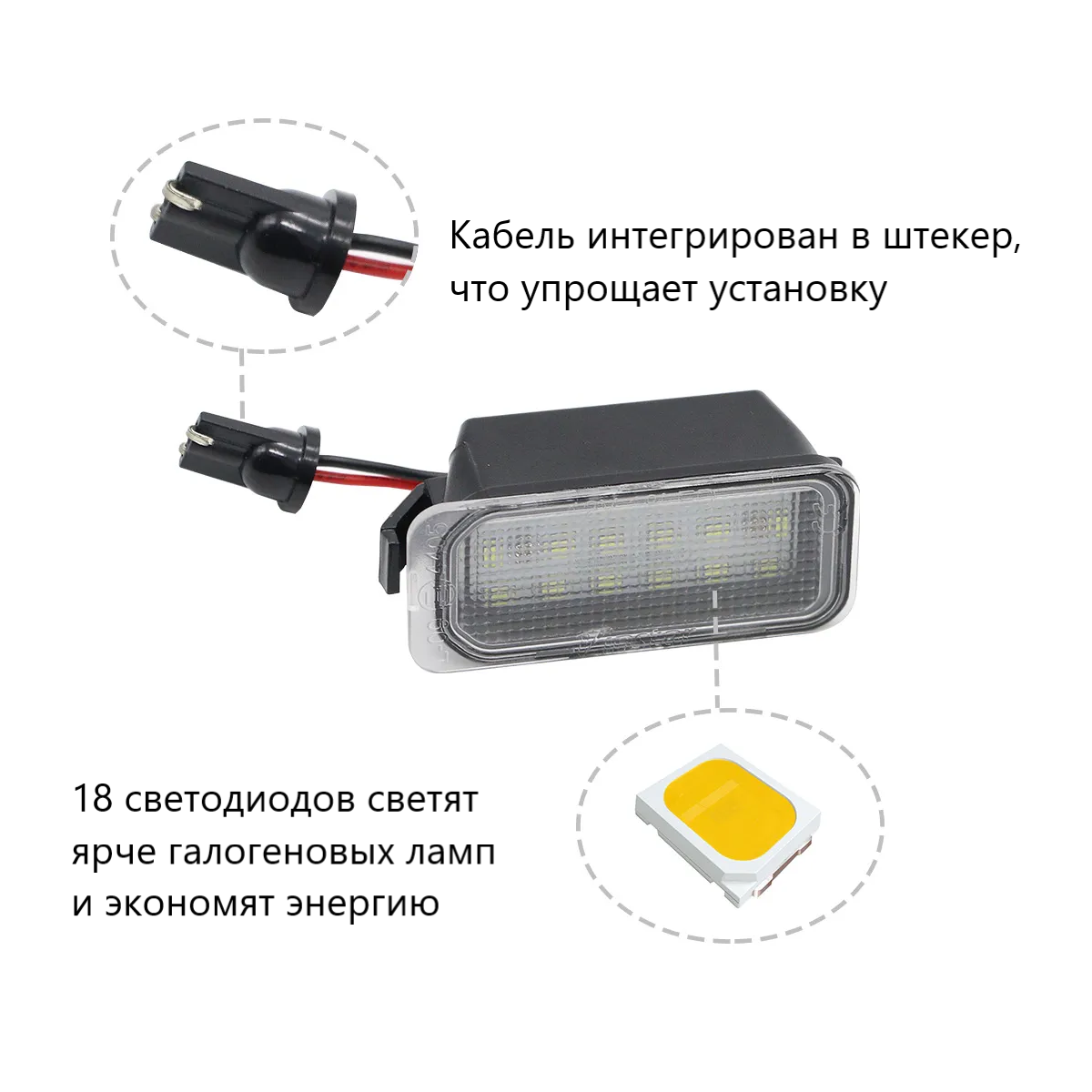 Комплект светодиодной подсветки номерного знака обладает высокой яркостью и при этом низкое потребление энергии. Фонари оборудованы штатным штекером и замком защелкой, что позволяет за считанные минуты произвести замену подсветки.
