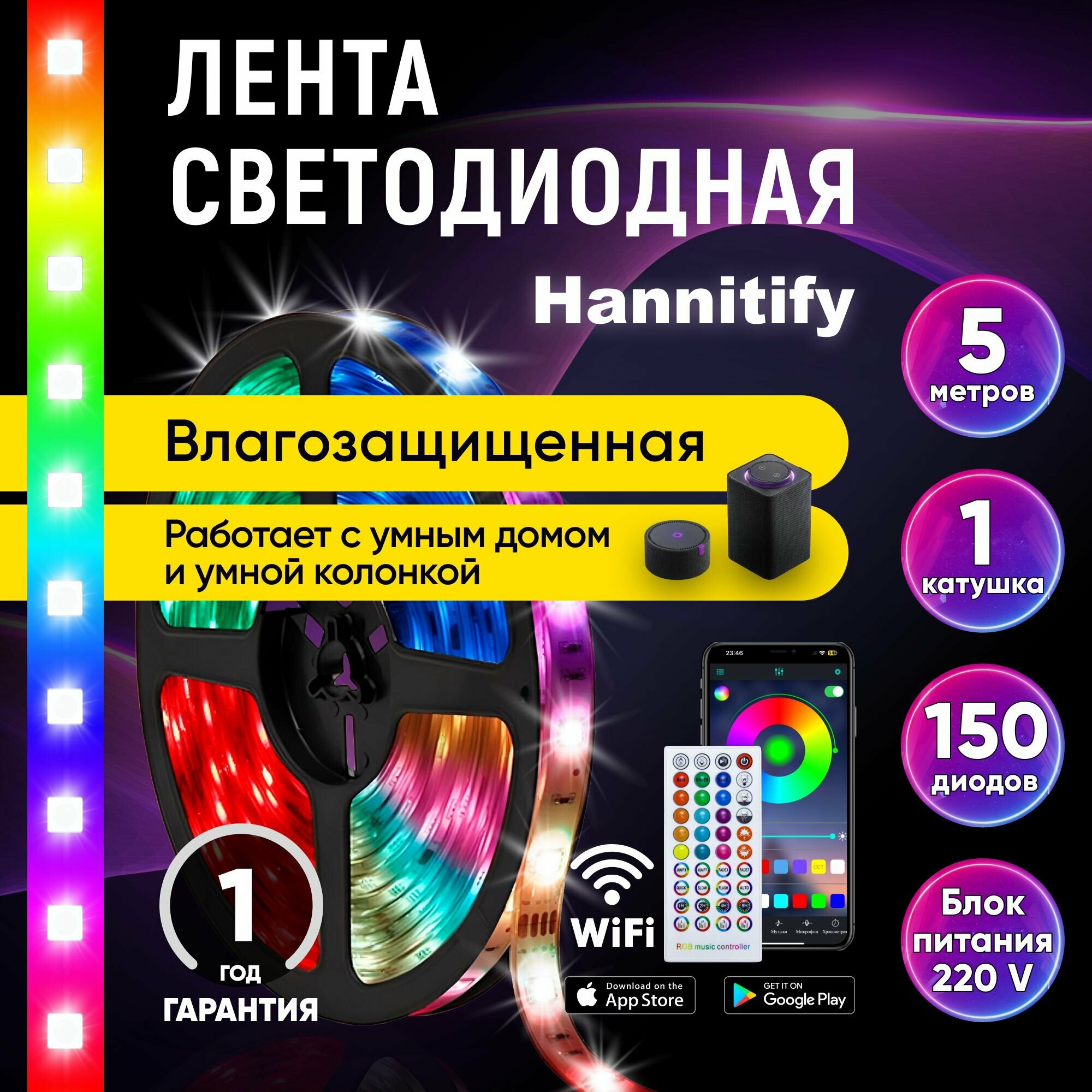 Светодиодная влагозащищенная лента Hannitify многоцветная с пультом 5 метров RGB SMD5050 с Wi-Fi, влагозащищенная светодиодная гибкая лента постоянного напряжения 12 Вольт, с блоком питания. Светодиодная лента Hannitify RGB с контроллером Wi-Fi.