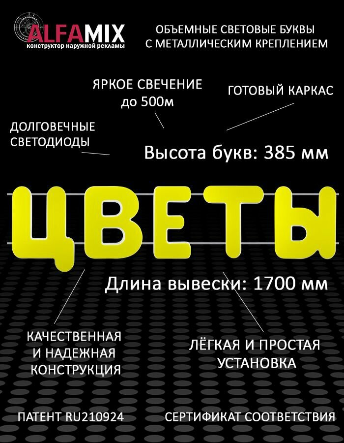 Световая вывеска цветы желтая высота букв 385мм из объемных букв для наружной и внутренней рекламы. Объемные буквы с металлическим модульным креплением (направляющих), внутри размещены светодиодные модули, сделаны из акрила. Конструкция Вывески Легкая, возможно беспроблемное крепление на любую стену. Светодиодная вывеска легко собирается и разбирается. Буквы возможно переставлять местами и заменять одну букву из цепочки, если она выйдет из строя. Размер одной буквы: высота 38,5 см, глубина 8 см, ширина- разная, зависит от буквы. СМ. размерную сетку в фотографиях к этой карточке. Свечение 1 режим. Предназначена как для внутреннего, так и для уличного применения. Влагостойкие, морозостойкие. Работают от 220 Вт, только через блок питания - трансформатор, который входит в комплект. Светящиеся буквы отправляются в виде уже собранной вывески в герметичном транспортированном коробке с пошаговой инструкцией по сборке (если вывеска состоит из большого количества букв, слово делится на цельные фрагменты, для дальнейшего самостоятельного соединение в цельное слово). Срок службы до 10 лет. Объемные буквы отлично подойдут для декора, на свадьбу инициалы, для фотозоны и т. д.