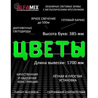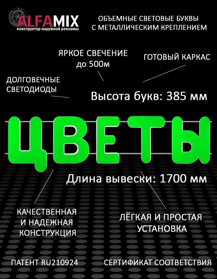 Световая вывеска цветы зеленая высота букв 385мм из объемных букв для наружной и внутренней рекламы. Объемные буквы с металлическим модульным креплением (направляющих), внутри размещены светодиодные модули, сделаны из акрила. Конструкция Вывески Легкая, возможно беспроблемное крепление на любую стену. Светодиодная вывеска легко собирается и разбирается. Буквы возможно переставлять местами и заменять одну букву из цепочки, если она выйдет из строя. Размер одной буквы: высота 38,5 см, глубина 8 см, ширина- разная, зависит от буквы. СМ. размерную сетку в фотографиях к этой карточке. Свечение 1 режим. Предназначена как для внутреннего, так и для уличного применения. Влагостойкие, морозостойкие. Работают от 220 Вт, только через блок питания - трансформатор, который входит в комплект. Светящиеся буквы отправляются в виде уже собранной вывески в герметичном транспортированном коробке с пошаговой инструкцией по сборке (если вывеска состоит из большого количества букв, слово делится на цельные фрагменты, для дальнейшего самостоятельного соединение в цельное слово). Срок службы до 10 лет. Объемные буквы отлично подойдут для декора, на свадьбу инициалы, для фотозоны и т. д.