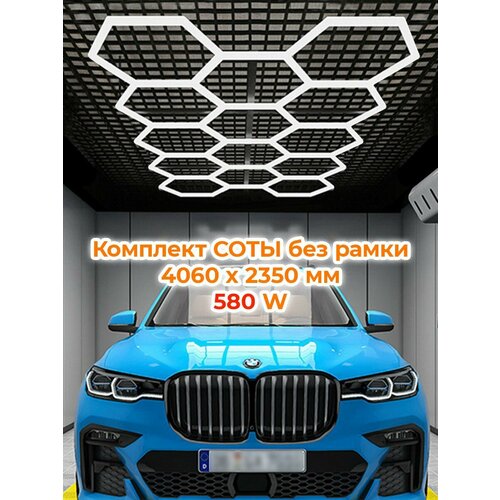 Яркий и модный потолочный (настенный) светодиодный модульный свет для гаража, автосервиса, автосалона, мастерской, модель соты - размер 4,060м x 2,350м.