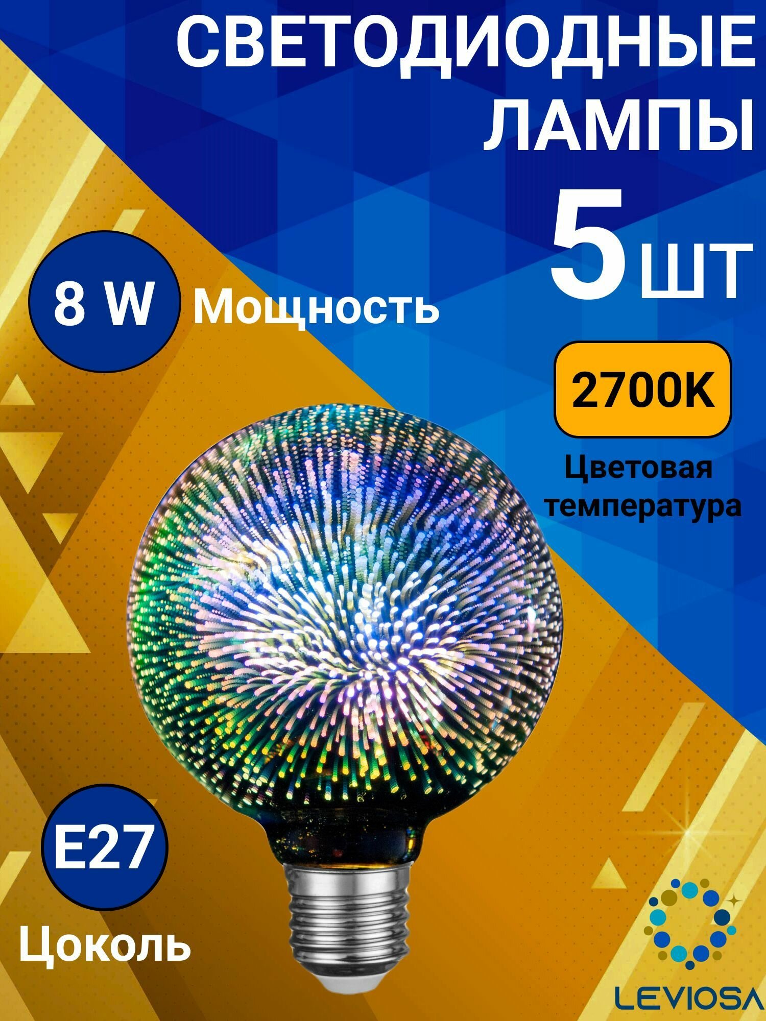 Лампочки филаментные Декоративный филамент G95 Наименование GLDEN-G95S-3D-8-230-E27-PICTURE-2700 Цоколь E27 Цветовая тем-ра K 2700 Мощность Вт 8 Световой поток лм 300 Угол рассеивания 360 Размеры мм 95*136 Комплект из 5 шт.