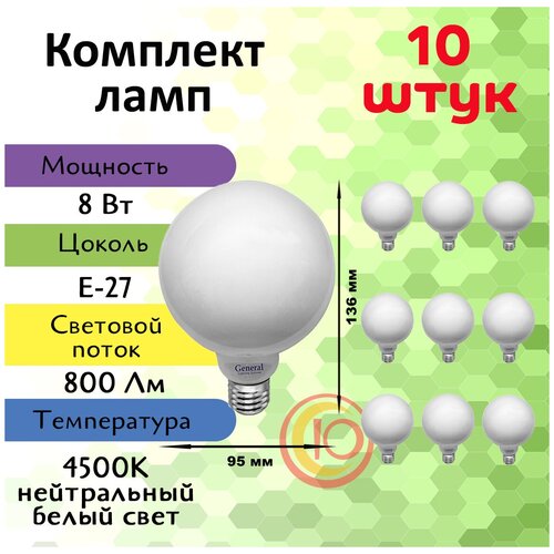 Светодиодные лампы филаментная, General, Комплект из 10 шт, Мощность 8 Вт, Цоколь E27, Нейтральный свет: сравнение цен, характеристики, фото, актуальное наличие и цены.