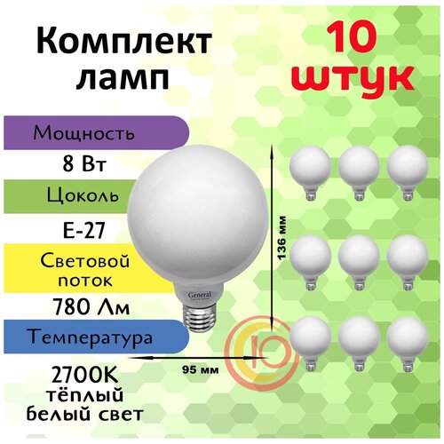 Светодиодные лампы филаментная, General, Комплект из 10 шт, Мощность 8 Вт, Цоколь E27, Теплый свет: сравнение цен, характеристики, фото, актуальное наличие и цены.