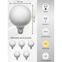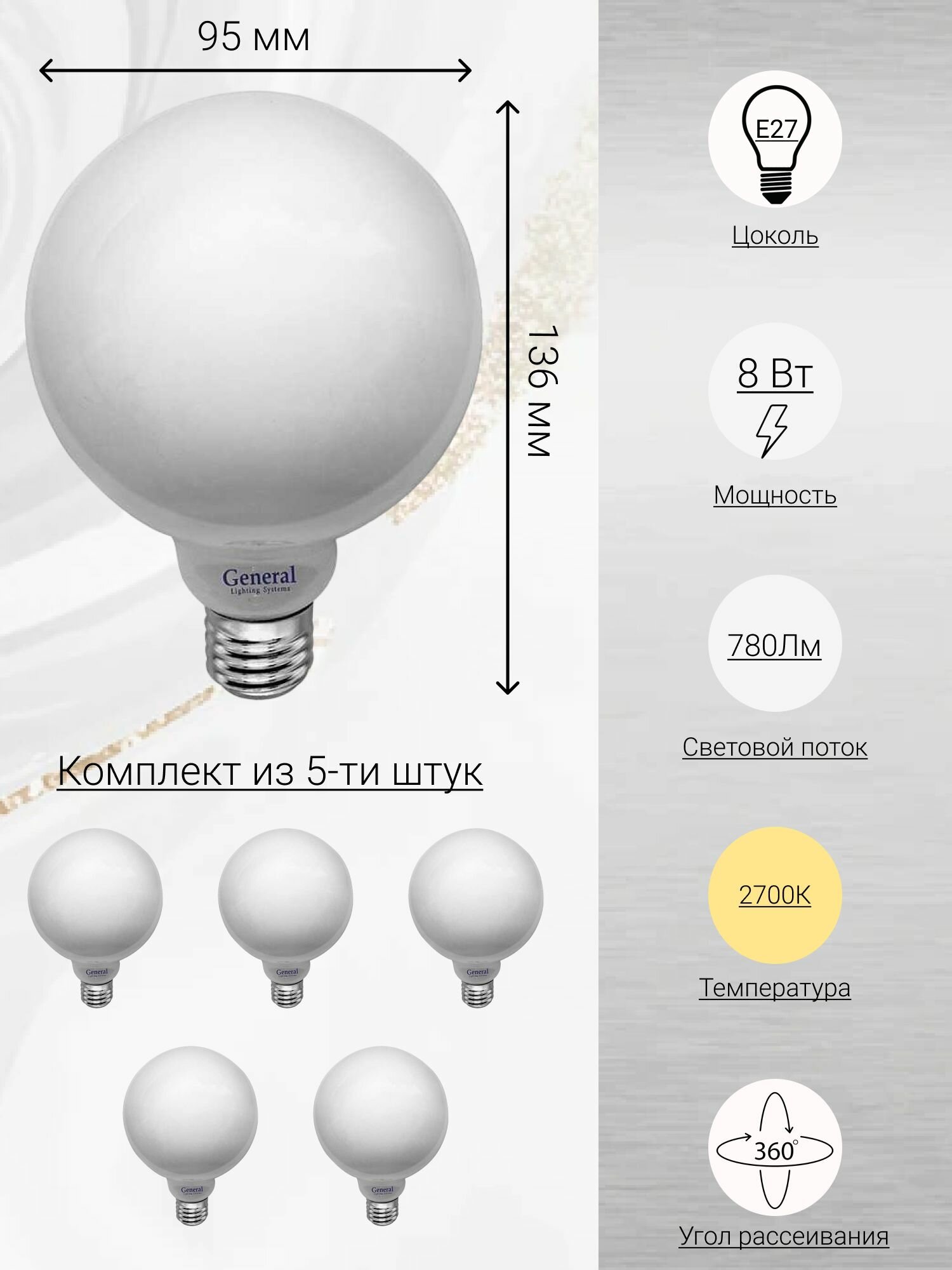 Купить General, Лампа светодиодная филаментная, Комплект из 5 шт, 8 Вт, Цоколь E27, 2700К, Форма лампы Шар, G95S с доставкой по всей России.