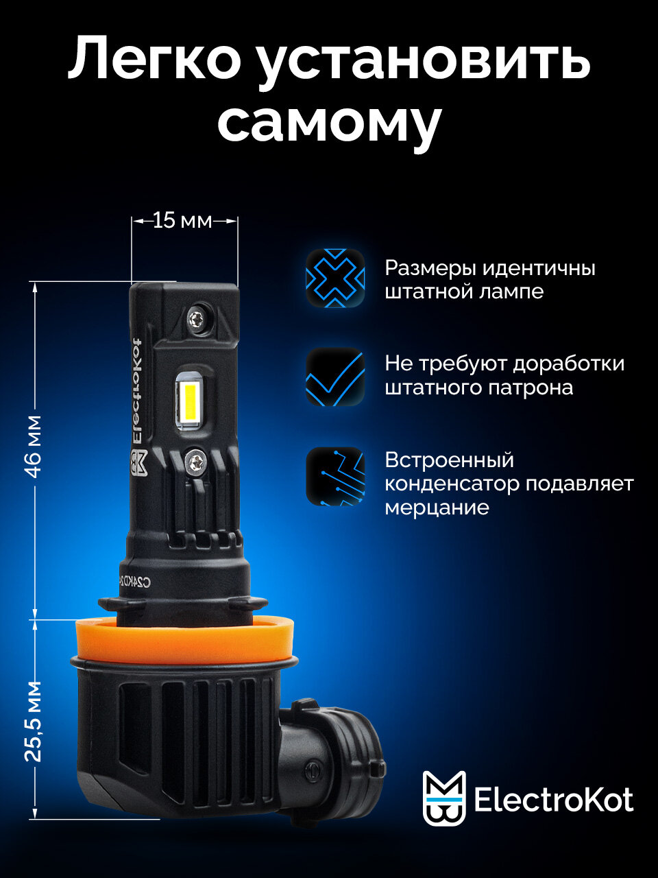 Светодиодные лампы H11 (H8, H9, H16jp) для авто ElectroKot MiniMax белый свет 5000K-6000K 2 шт, в ближний/дальний/ПТФ: сравнение цен, характеристики, фото, актуальное наличие и цены.