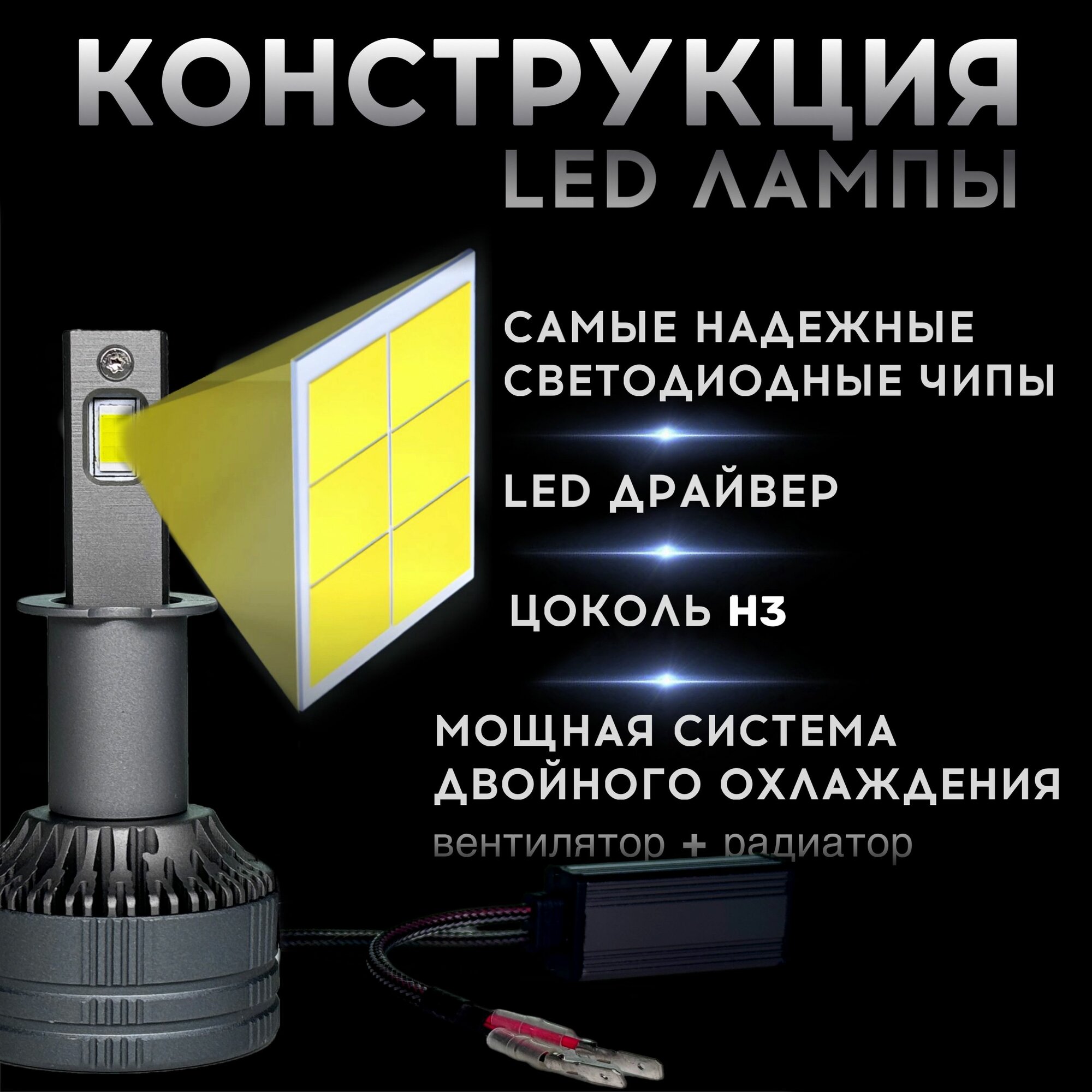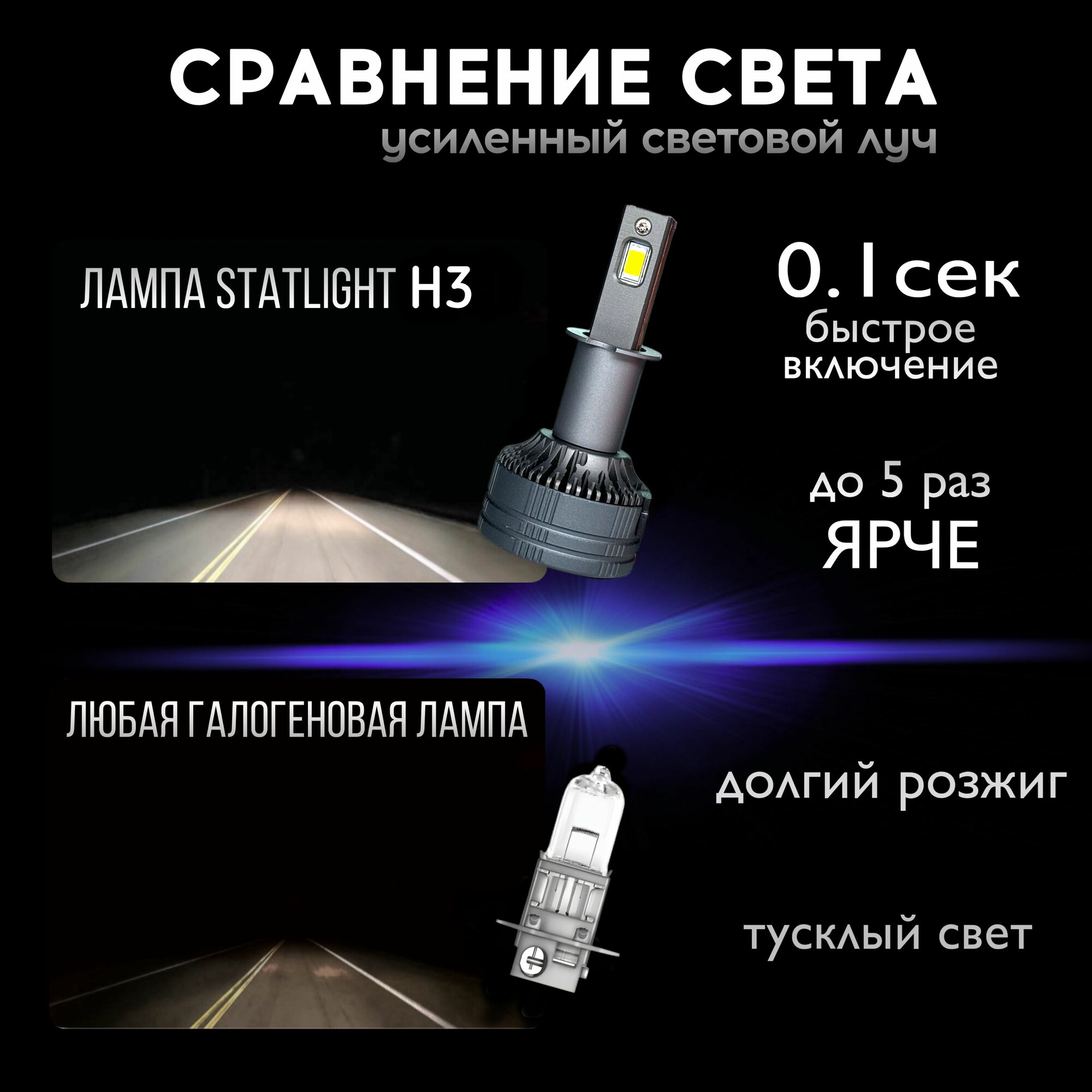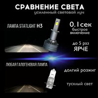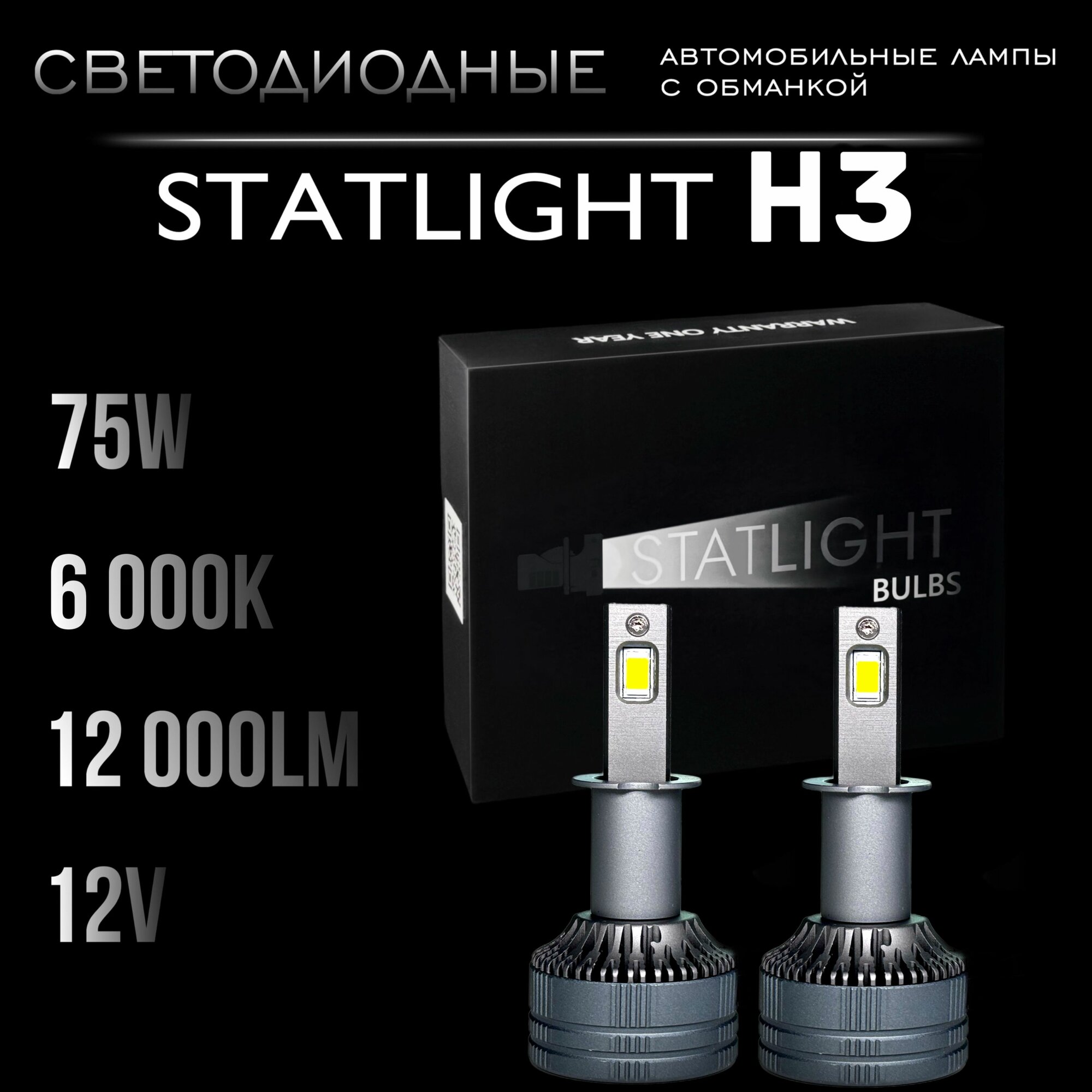 Премиум качество! Максимальное качество за скромный бюджетCветодиодные лампы STATLIGHT LED H3 обладают по истине впечатляющими характеристиками. Высокая мощность - 75wСветовой поток - 12 000 LmМатериал корпуса - авиационный алюминий 6063. Класс влагозащиты - IP68Холодный белый свет - 6000 КЦоколь - H3Напряжение питания - 12В (работают и от 24В)Чёткая светотеневая границаНЕ слепит встречные авто! В отличии от бюджетных аналогов, лампа STATLIGHT обладает чёткой светотеневой границей в любой оптике, благодаря тому, что диоды расположены идентично нити накаливания у галогеновой лампы. Мощное охлаждение. Cветодиодная лампа STATLIGHT имеет двойное охлаждение, радиатор + кулер. Вертикально расположенные ребра радиатора с увеличенной площадью поверхности, выполненные из авиационного алюминия, обеспечивают более эффективное охлаждение по сравнению с аналогами. Мощный электрокулер с интеллектуальным приводом, отлично отводит тепло, и позволяет работать лампе в самых экстремальных погодных условиях. Штатное подключениеКаждый цоколь лампы имеет штатную фишку подключения, благодаря этому, вы с лёгкостью установите их на любой автомобиль.