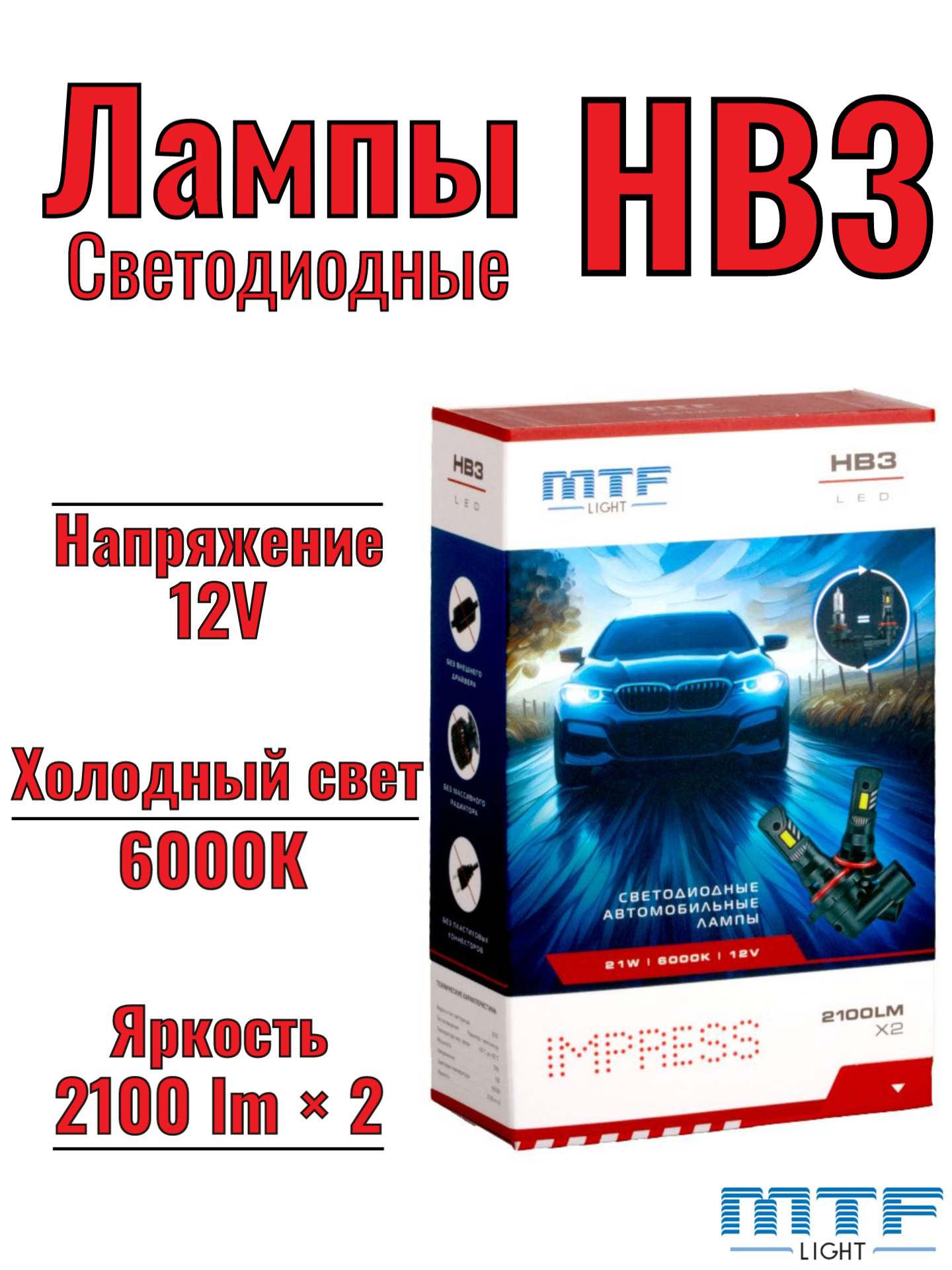 Светодиодные лампы HB3(9005), MTF Light серия IMPRESS, 12V, 21W, 2100LM, 6000K,(штатн. размер), к-т.: сравнение цен, характеристики, фото, актуальное наличие и цены.