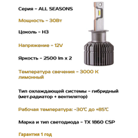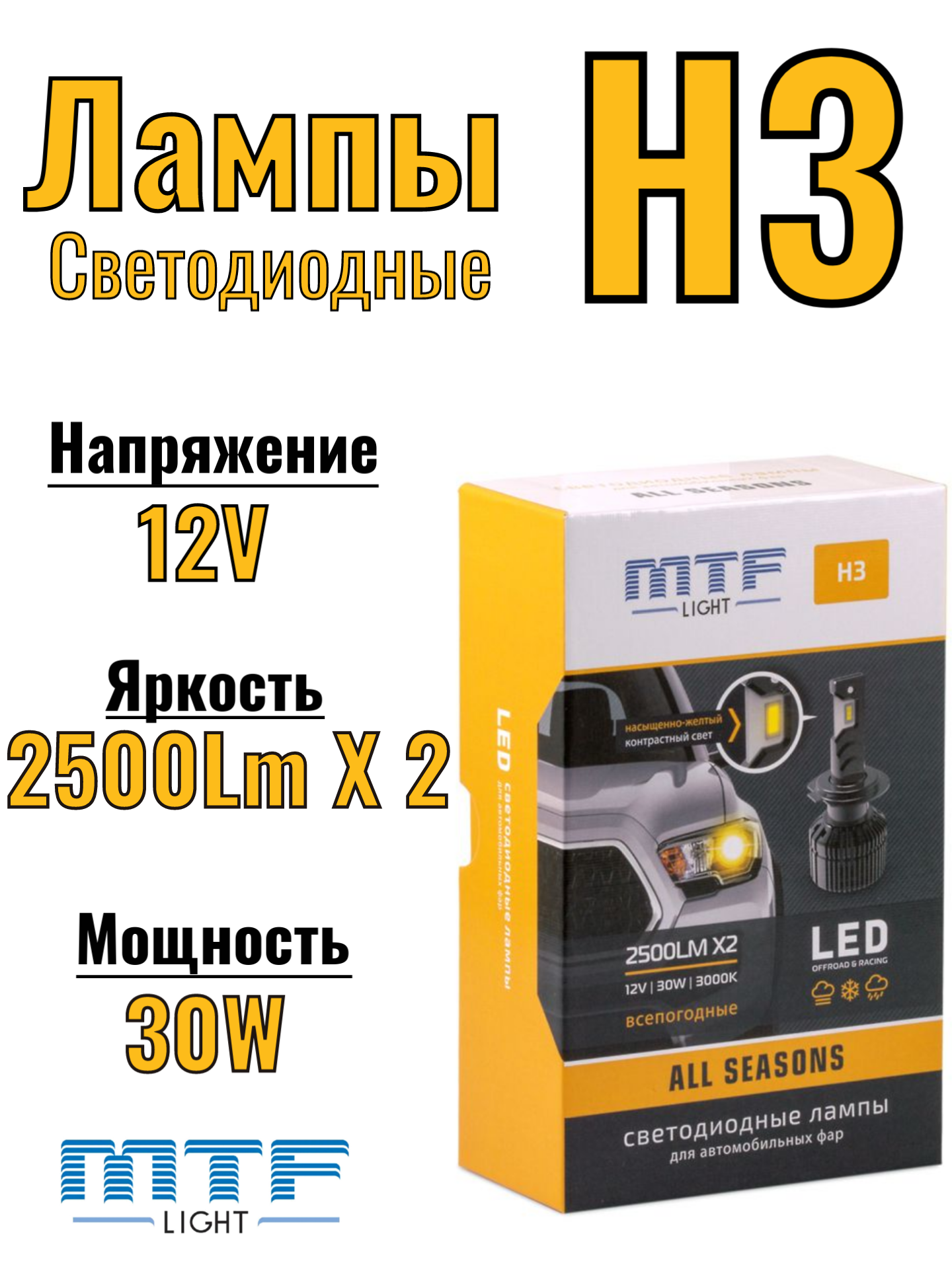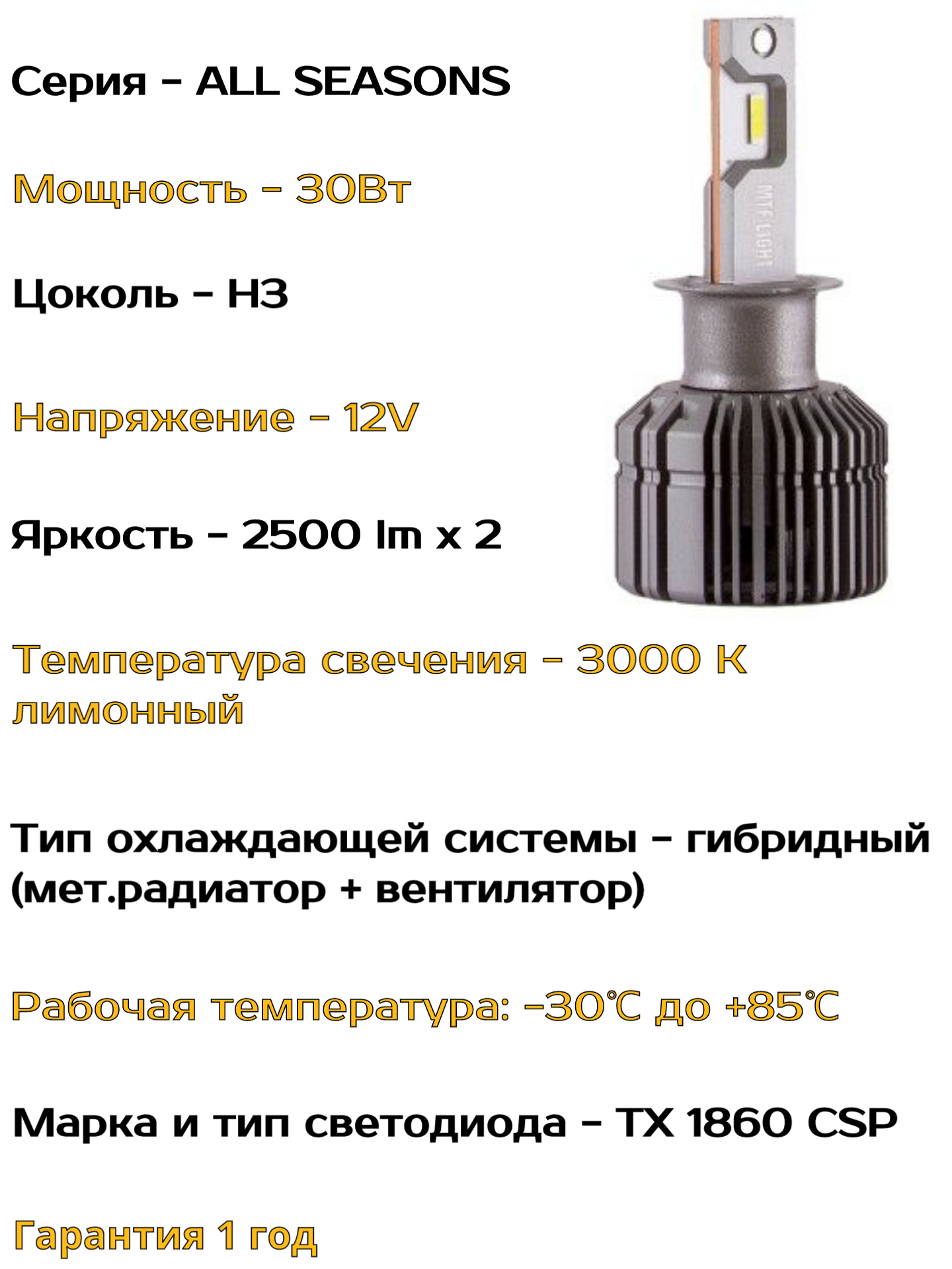 Светодиодные лампы H3 MTF Light, серия ALL SEASON LED, 30W, 2500lm, 3000K, кулер, комплект.: сравнение цен, характеристики, фото, актуальное наличие и цены.