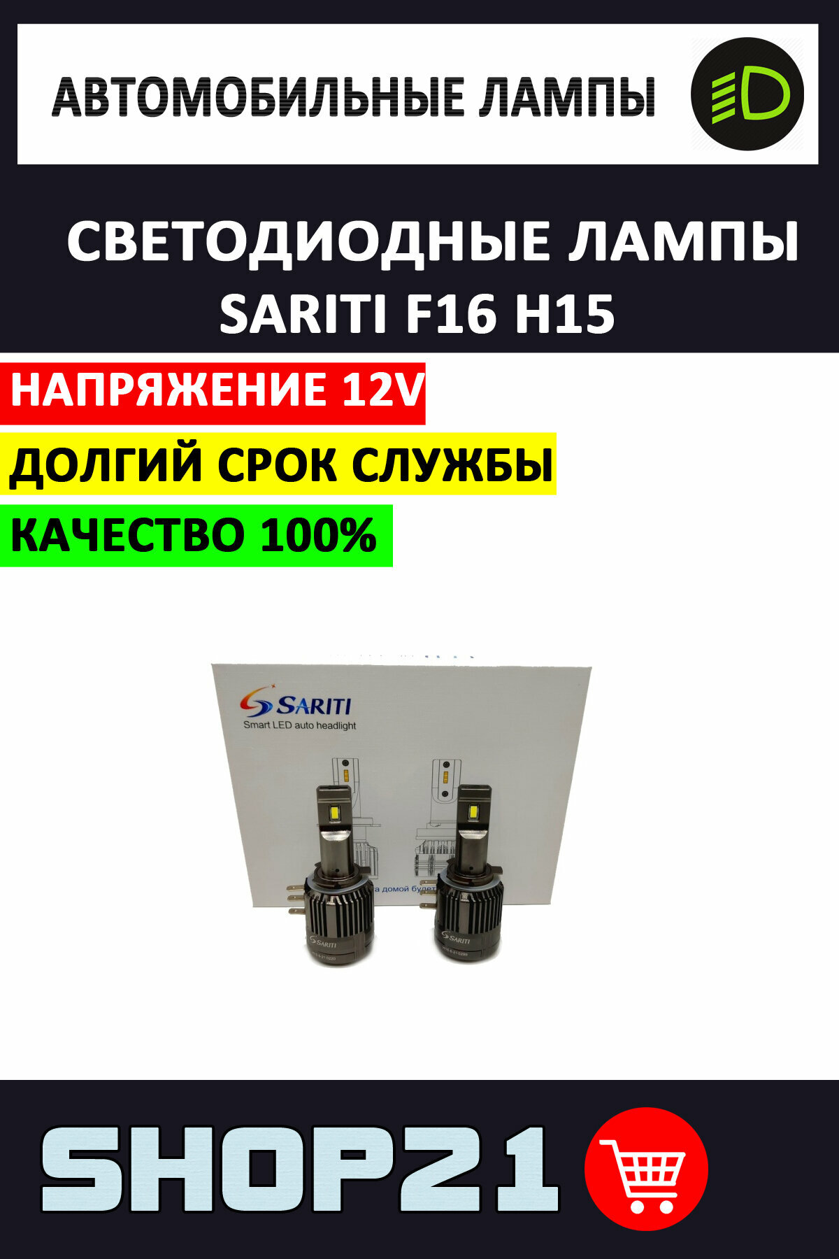LED-лампы головного света Sariti F16 с Обманкой CanbusЛампы головного освещения Sariti F16 разработаны для максимальной производительности. Их отличительные характеристики — низкая цена и увеличенная на 130% яркость света и долгий срок службы. Срок службы до 50000 часов позволяет LED лампам занять первое место среди конкурентов Разработаны специально для эксплуатации в жёстких климатических условиях, имеют встроенную обманку Canbus. Характеристики: