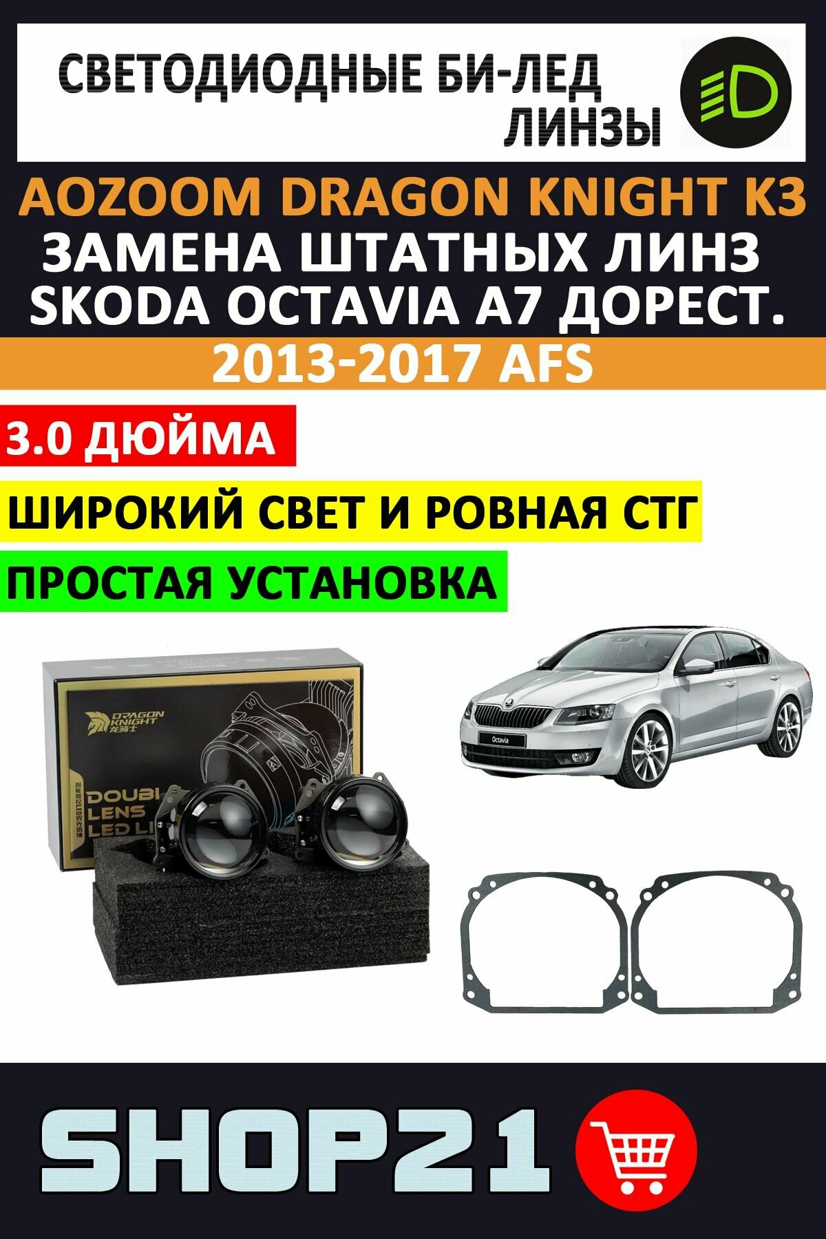 Би-лед светодиодные модули / линзы Aozoom Dragon Knight K3 5500K 3.0 дюйма для автомобилей Skoda Octavia A7 дорестайлинг 2013-2017 c AFS