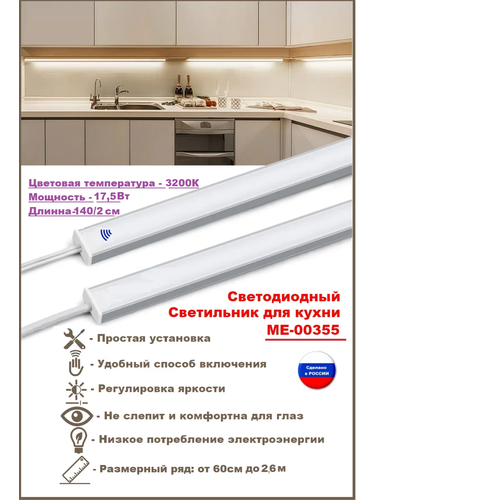 Светодиодный светильник МЕ-00355 140 см, 3200 K- теплый, предназначена для подсветки рабочей зоны на кухне. Светильник состоит из 2х равных частей 70 см и+70 см, соединенные между собой гибким проводом. Светильник можно устанавливать, как линейный, в одну линию с общей длиной 140 см. , так и в угловую кухню, под углом и сторонами по 70 см.