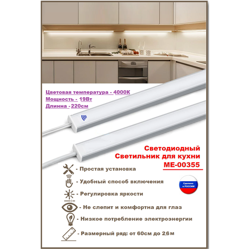 Светодиодный светильник МЕ-00355 240 см, предназначена для подсветки рабочей зоны на кухне. Светильник состоит из 2х равных частей 120 см и+120 см, соединенные между собой гибким проводом. Светильник можно устанавливать, как линейный, в одну линию с общей длиной 240 см. , так и в угловую кухню, под углом и сторонами по 120 см.