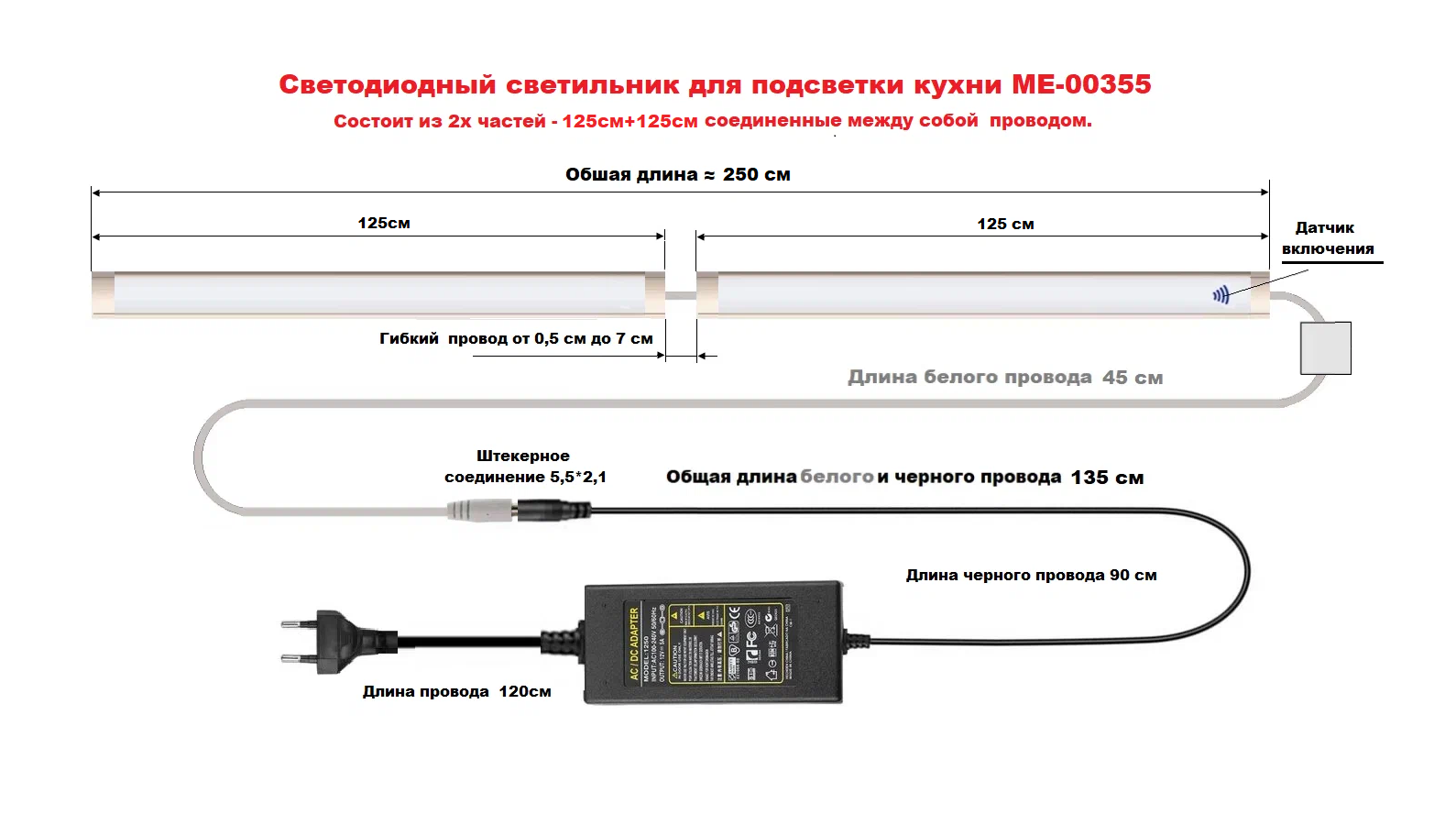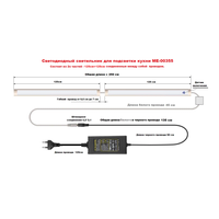 Светодиодный светильник МЕ-00355 250 см, 3200К теплый белый, предназначена для подсветки рабочей зоны на кухне. Светильник состоит из 2х равных частей 125 см и+125 см, соединенные между собой гибким проводом. Светильник можно устанавливать, как линейный, в одну линию с общей длиной 250 см. , так и в угловую кухню, под углом и сторонами по 125 см.