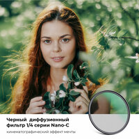Светофильтр K&F Concept Black Diffusion 1/4 HMC 49mm смягчает общий контраст, создавая слегка уменьшенный перламутровый ореол вокруг источников света. Фильтр отлично подходит для сглаживания нежелательных пятен, морщин или других деталей на лице объекта, сохраняя при этом общее изображение в фокусе.