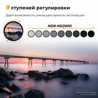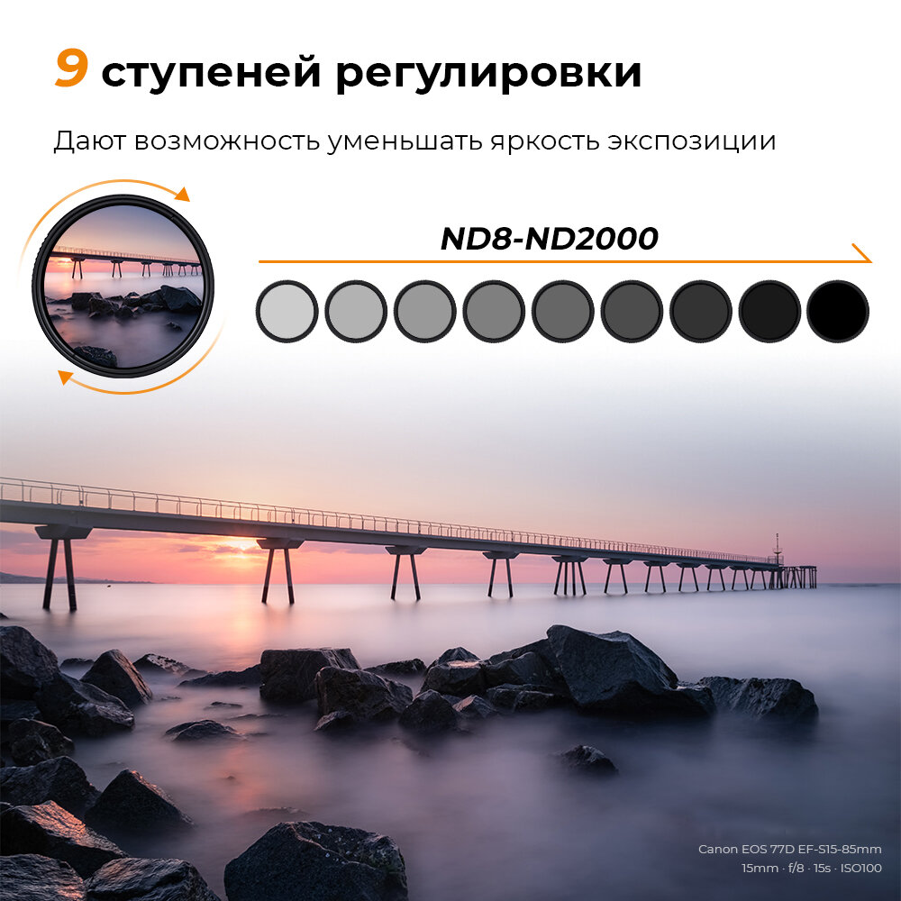 Профессиональный нейтральный светофильтр от бренда K&F Concept, предназначенный для объективов диаметром 67 миллиметров. Используется для съемок с открытой диафрагмой и разными значениями выдержки в условиях яркого солнечного света. Имеет переменную плотность от 8 до 2000 ND. Не ухудшает цветопередачу, не влияет на резкость изображения благодаря мультипросветленной линзе. Олеофобное покрытие защищает фильтр от появления жирных пятен и следов от пальцев. Модель защищена от царапин, случайных ударов.