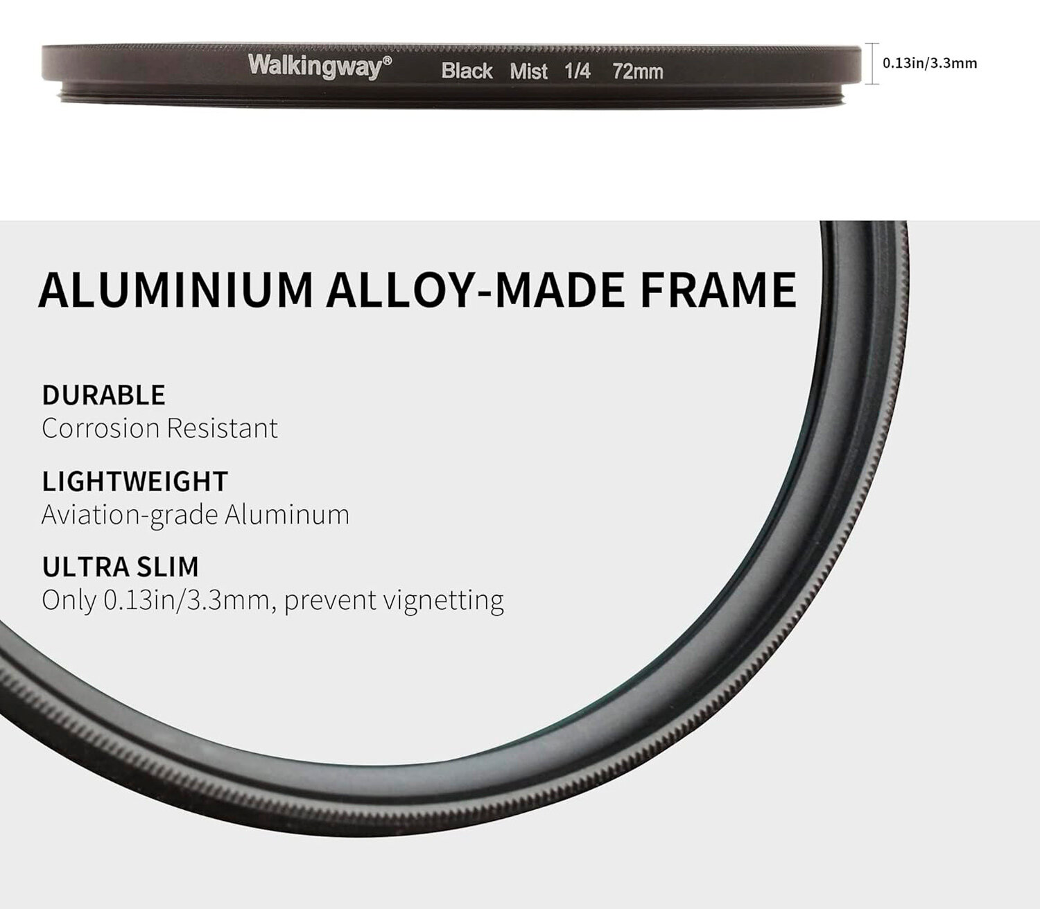 Светофильтры Walking Way Black Mist 1/4 выполняются из минерального оптического стекла с многослойным просветлением для защиты от ореолов и бликов. Светопропускаемость составляет 90%. Верхний слой покрытия – твердый, устойчивый к царапинам. Он также обладает олеофобными и водоотталкивающими свойствами: капли воды быстро скатываются с поверхности, не оставляя следа, отпечатки пальцев легко счищаются. Черненая оправа изготавливается из алюминиевого сплава. Толщина оправы составляет 3.2 мм (не считая резьбу, которая закручивается в объектив), поэтому такой фильтр можно использовать с широкоугольными объективами, не опасаясь усиленного виньетирования.
