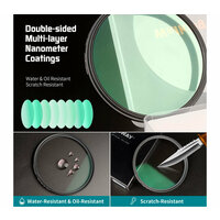 Светофильтры Walking Way Black Mist 1/4 выполняются из минерального оптического стекла с многослойным просветлением для защиты от ореолов и бликов. Светопропускаемость составляет 90%. Верхний слой покрытия – твердый, устойчивый к царапинам. Он также обладает олеофобными и водоотталкивающими свойствами: капли воды быстро скатываются с поверхности, не оставляя следа, отпечатки пальцев легко счищаются. Черненая оправа изготавливается из алюминиевого сплава. Толщина оправы составляет 3.2 мм (не считая резьбу, которая закручивается в объектив), поэтому такой фильтр можно использовать с широкоугольными объективами, не опасаясь усиленного виньетирования.