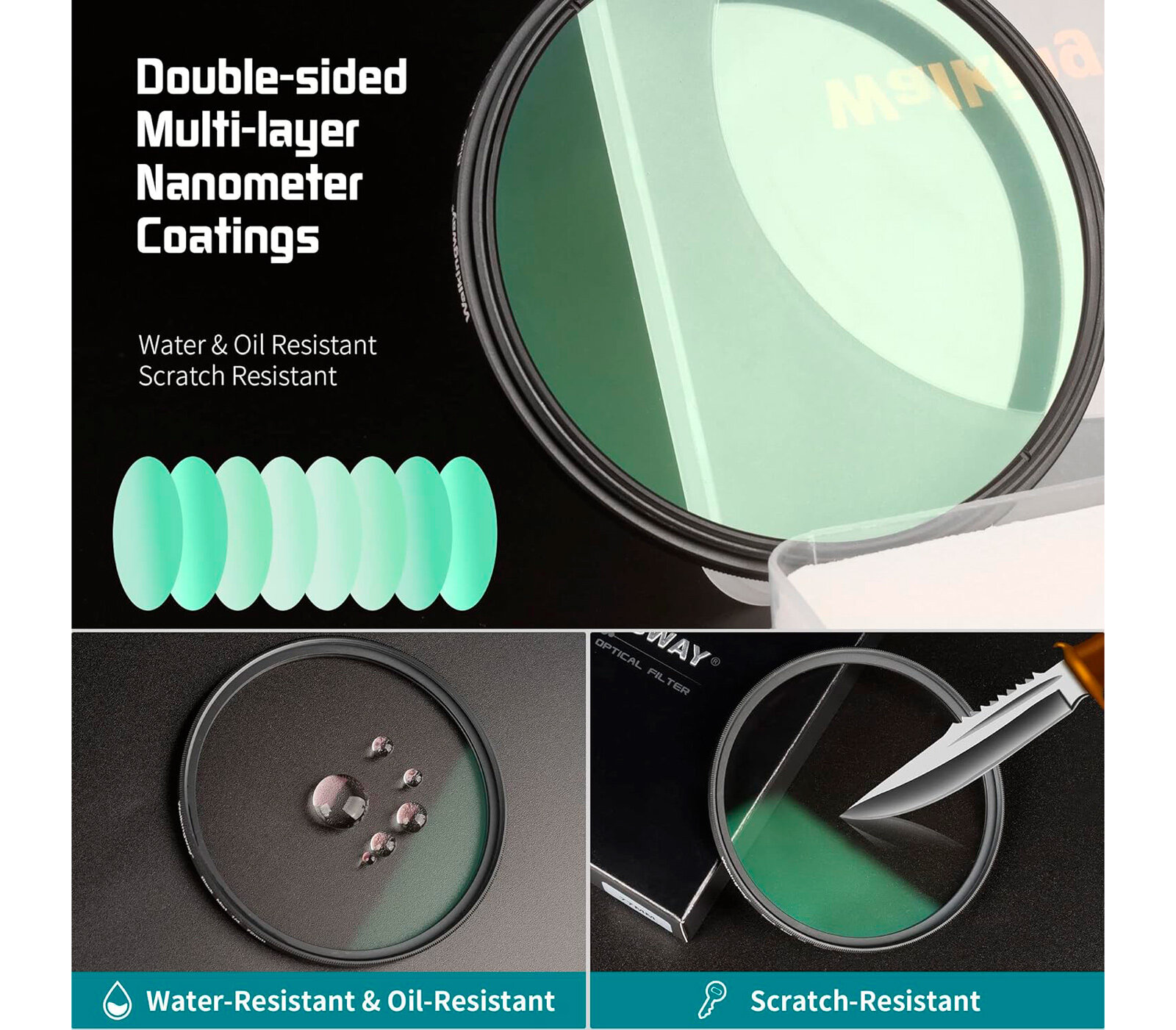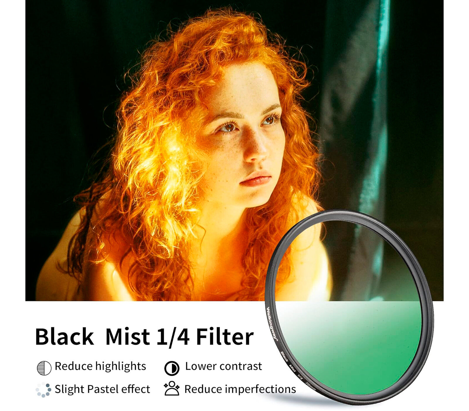 Светофильтры Walking Way Black Mist 1/4 выполняются из минерального оптического стекла с многослойным просветлением для защиты от ореолов и бликов. Светопропускаемость составляет 90%. Верхний слой покрытия – твердый, устойчивый к царапинам. Он также обладает олеофобными и водоотталкивающими свойствами: капли воды быстро скатываются с поверхности, не оставляя следа, отпечатки пальцев легко счищаются. Черненая оправа изготавливается из алюминиевого сплава. Толщина оправы составляет 3.2 мм (не считая резьбу, которая закручивается в объектив), поэтому такой фильтр можно использовать с широкоугольными объективами, не опасаясь усиленного виньетирования.