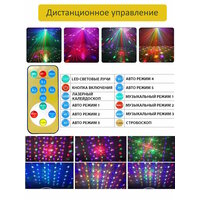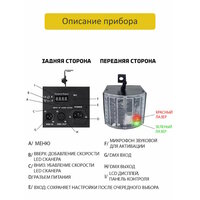 Светодиодный прибор 2 в 1: лазерный эффект, световой эффект. Режимы работы: автоматический, звуковой (встроенный микрофон), DMX512. Варианты управления: ручное - с помощью кнопок на задней панели прибора через дисплей, с помощью пульта дистанционного управления.
