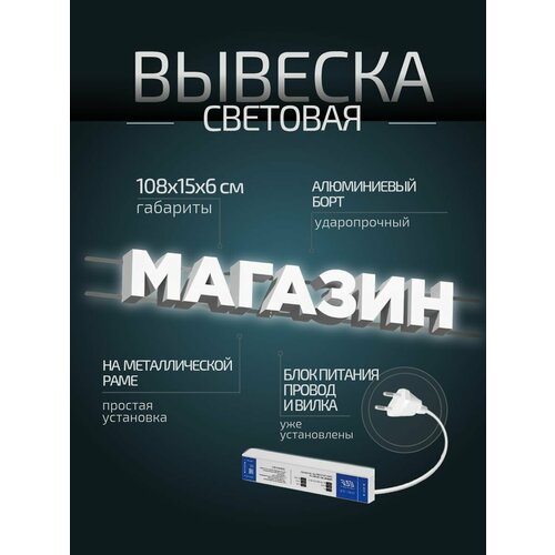 Световая вывеска "Магазин" - это идеальное решение для любого бизнеса, который хочет привлечь внимание клиентов и создать уникальную атмосферу вокруг своего магазина. Эта вывеска изготовлена из металла, органического стекла и акрила, что обеспечивает ее долговечность и прочность.