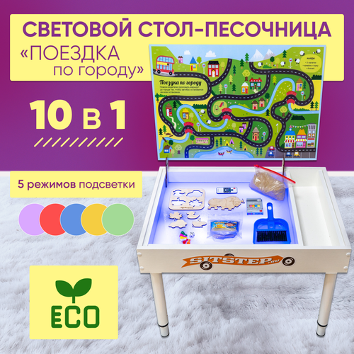 Стол песочница световой Sitstep «Поездка по городу» - многофункциональный столик, который подходит для игр, обучения и творчества.