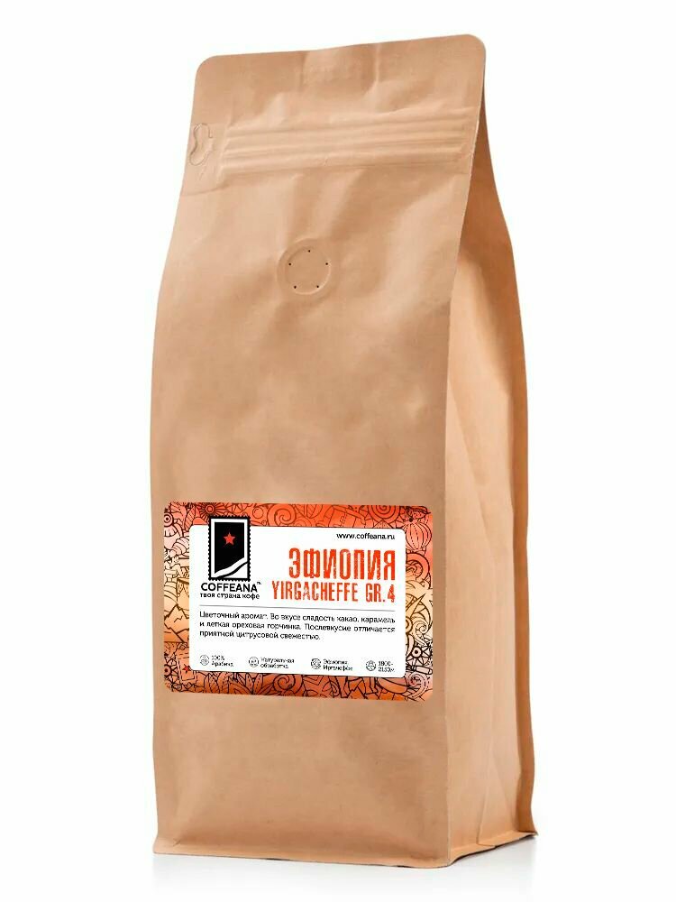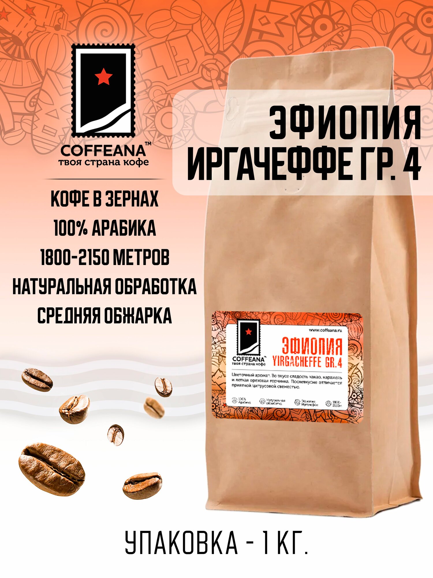 Купить Свежеобжаренный кофе COFFEANA Эфиопия Иргачеффе гр. 4 в зернах 1000 гр. с доставкой по всей России.