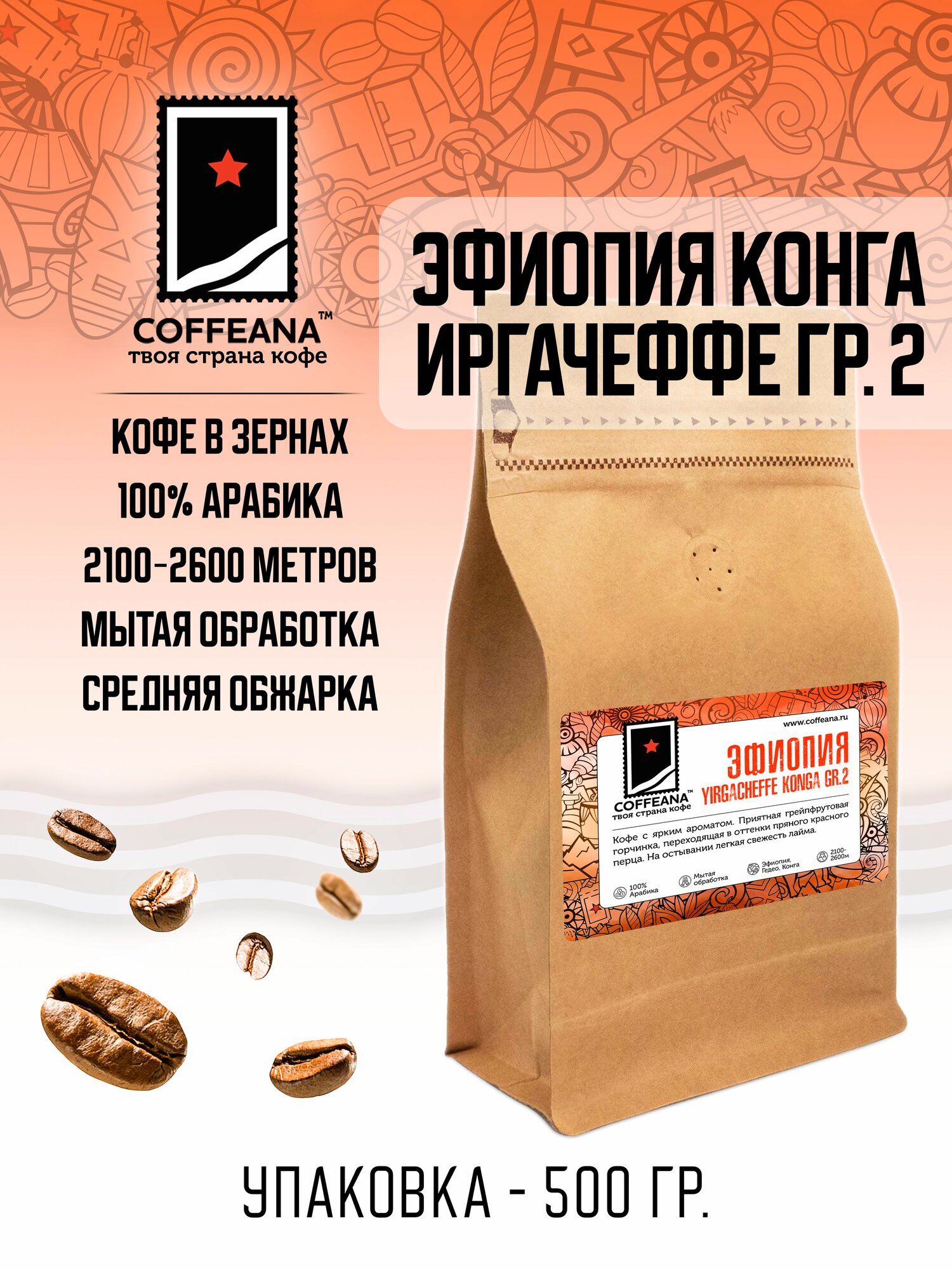 Свежеобжаренный кофе COFFEANA Эфиопия Иргачеффе Конга гр. 2 в зернах 500 гр.