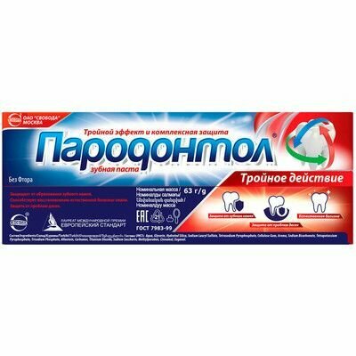 Вода, сорбитол/ глицерин, диоксид кремния, натрия лаурилсульфат, тетранатрия пирофосфат, натрий-карбоксиметилцеллюлоза, ароматическая композиция, бикарбонат натрия, тетракалия пирофосфат, тринатрийфосфат, аллантоин, карбомер, диоксид титана, метилпарабен, натрия сахарин, циннамаль, эвгенол.