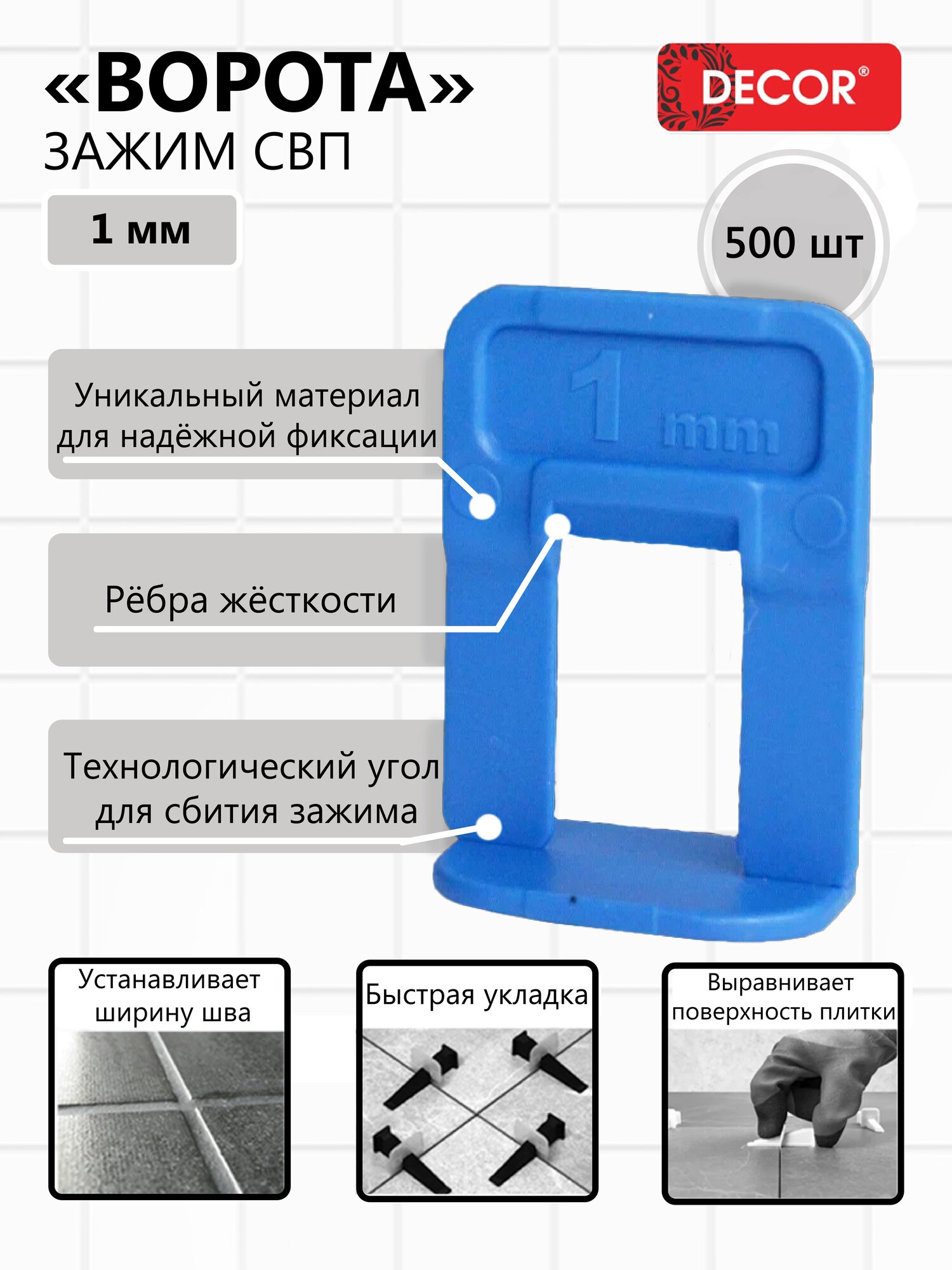 СВП, Зажим «Ворота», 1 мм, DECOR, 500 штук в упаковке, для плитки высотой от 4 до 14 мм.: сравнение цен, характеристики, фото, актуальное наличие и цены.