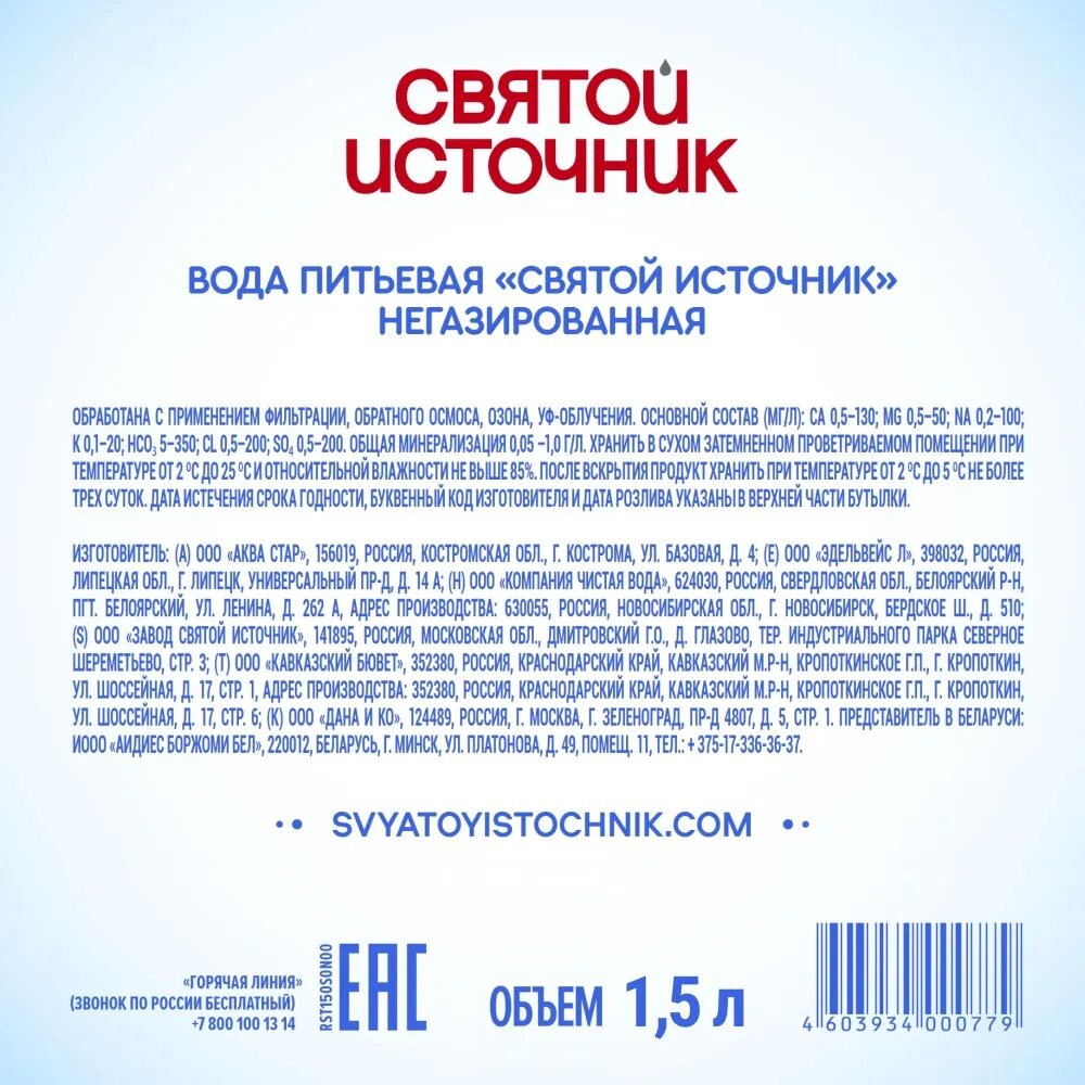 'Святой Источник' - питьевая вода, при производстве которой используется природная вода, добытая из артезианских скважин. Благодаря этому, в ее составе содержится оптимальное количество солей и микроэлементов. Использование щадящих методов фильтрации, не нарушает природную структуру воды, сохраняя всю пользу для человека. Как лидер категории, бренд 'Святой Источник' заботится о своих потребителях и рекомендует следить за водным балансом, чтобы поддержать свое здоровье и своих близких. Минерализация: 0,1-0,5 г/л. Содержание основных ионов мг/л: кальций < 80, магний <20, калий <20, гидрокарбонаты <250, хлориды <150, сульфаты <50. Общая жесткость < 6 мг экв/л.