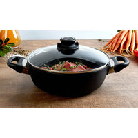 Крышка Swiss Diamond выполнена из высококачественного термостойкого стекла и имеет металлический ободок. На крышке имеется термостойкая ручка, что позволяет использовать ее для готовки в духовке при температуре до 260 градусов, так же предусмотрена вентиляция, что позволяет пару выходить не повышая при этом давление внутри посуды, в которой готовится пища. Крышка Swiss Diamond подходит для мытья в посудомоечной машине.