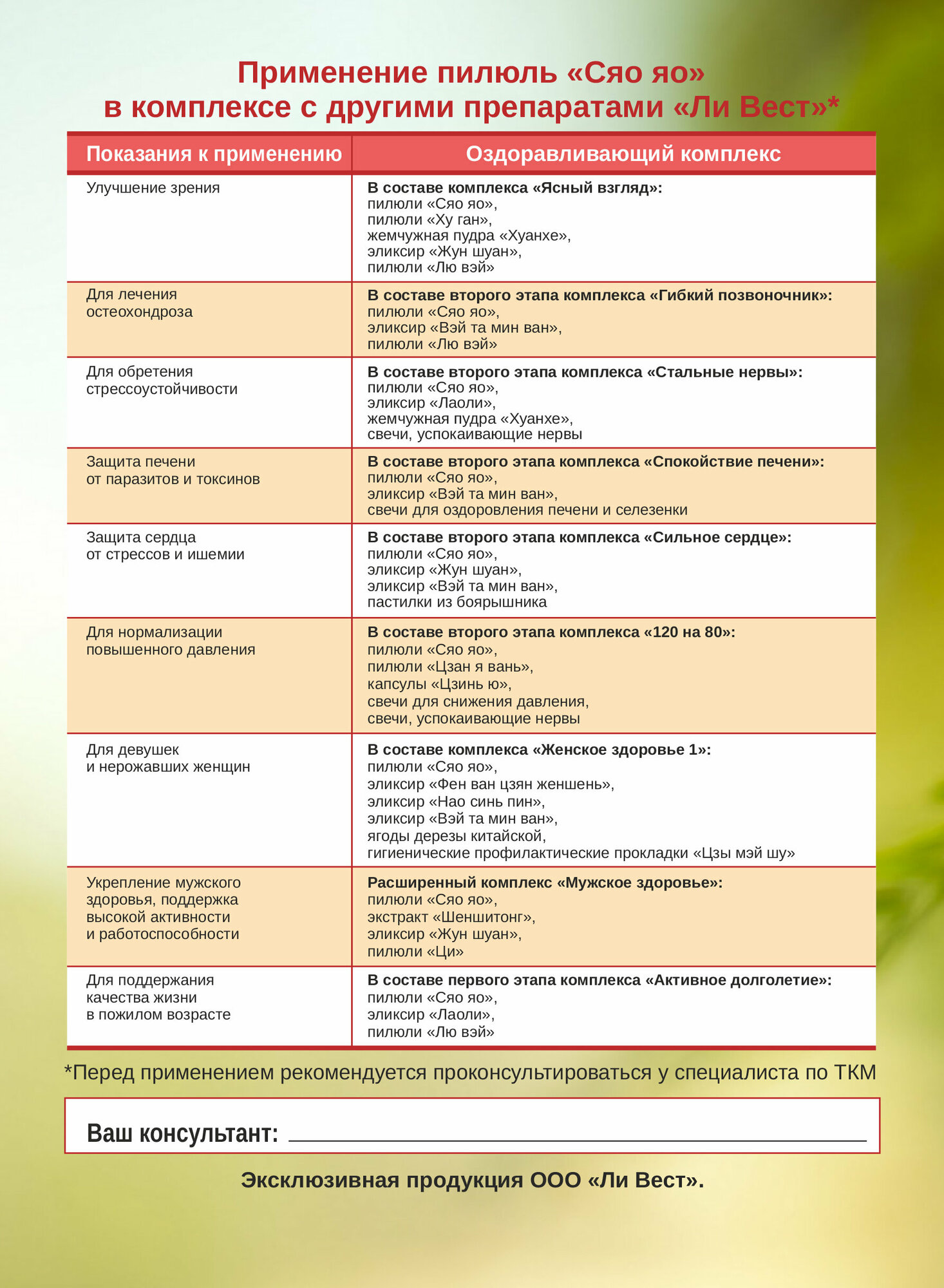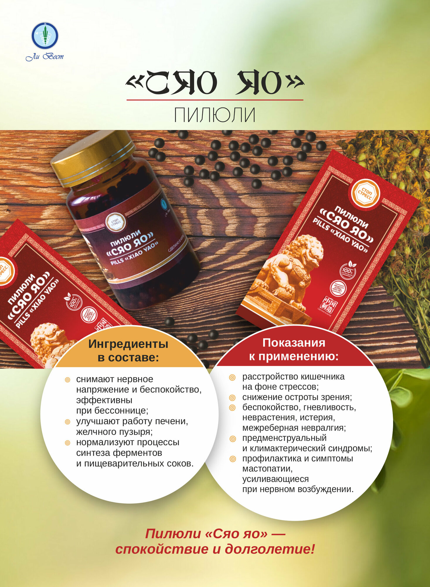 Древнее, давно известное в Китае средство «Сяо Яо» способное быстро и эффективно снимать нервное напряжение, которое возникает в связи с застоем печени. Кроме этого пилюли замечательно снимают симптомы любого беспокойства, нервного напряжения, убирают бессонницу. Улучшают и стабилизируют работу желчного пузыря, печени, восстанавливают кроветворную естественную функцию селезенки. «Сяо Яо» восстанавливают нормальный синтез ферментов и пищеварительного сока.