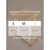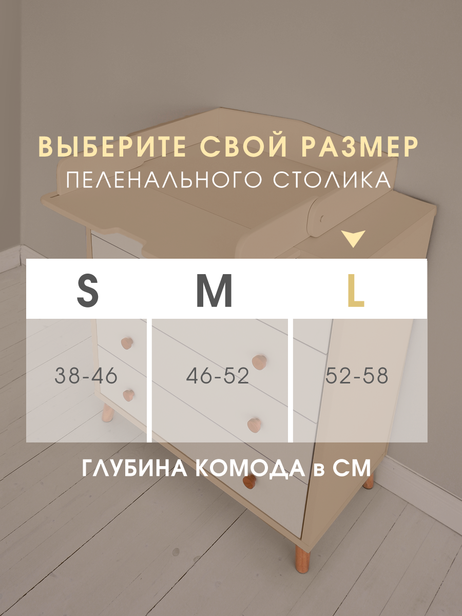 Пеленальная доска в размере L подойдёт для комодов глубиной 52-58 см.