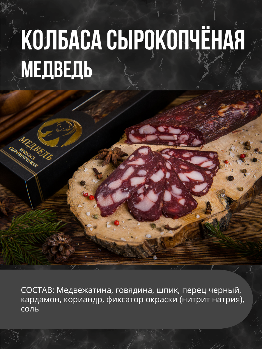 Наша колбаса "Медведь" - это яркий представитель высококачественной колбасной продукции собственного производства. Мы гордимся своими традициями и следим за каждым этапом производства, чтобы доставить вам только лучший натуральный продукт. Эта колбаса "Медведь" не просто покупка, это настоящий подарок для ценителей вкуса и качества от Деликатес Дичь. Упакованная в эксклюзивную подарочную упаковку, она станет идеальным подарком для друзей, близких и коллег. Порадуйте своих близких уникальным вкусом и оригинальным подарком. Готовое блюдо с нашей колбасой "Медведь" - это не просто еда, это настоящий кулинарный шедевр. Насыщенный аромат и неповторимый вкус этой колбасы превратят ваш обычный обед в удовольствие и праздник для ваших вкусовых рецепторов. Натуральный продукт с ярким характером - именно так можно описать нашу колбасу "Медведь". Без консервантов, красителей и искусственных добавок - только натуральные ингредиенты, которые делают этот продукт безупречным вкусовым удовольствием. Не упустите возможность попробовать нашу колбасу "Медведь" - и вы по достоинству оцените ее великолепный вкус и высокое качество. Позвольте себе и своим близким насладиться настоящим гастрономическим опытом с этим уникальным продуктом!