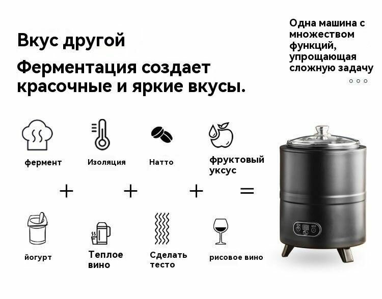 ▶Автоматическая интеллектуальная машина для йогурта Venus, ферментер для десертного вина, риса, вина, является многофункциональным оборудованием для ферментации двойного назначения для домашнего и коммерческого использования. Стеклянная крышка и вкладыш из нержавеющей стали приняты для обеспечения безопасности пищевых продуктов и гигиены. Оборудование оснащено компьютерной панелью с ЧПУ, которая проста в эксплуатации, имеет интеллектуальное время и постоянную температуру, а также сохраняет стабильный процесс ферментации. Мощность 400 Вт и напряжение 220 В могут соответствовать различным требованиям пивоварения. ▶Эта машина йогурта может не только сделать традиционный йогурт, но также быть использована для того чтобы заквашивать энзимы, натто, уксус плода, етк. Кроме того, машины можно использовать для брожения теплого вина, приготовления лапши и даже приготовления рисового вина. Многофункциональный дизайн Отвечает ежедневным разнообразным потребностям семей. ▶Полностью автоматическая интеллектуальная машина для йогурта Venus, ферментер для десертного вина, риса, вина с изоляцией, может поддерживать непрерывное брожение продуктов при соответствующей температуре. С ним легко работать как для домашнего, так и для коммерческого использования. Хотите ли вы домашний вкусный йогурт или наслаждайтесь домашним рисом, этот многофункциональный ферментер может удовлетворить ваши потребности. Позвольте вам насладиться домашней едой на кончике вашего языка.