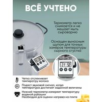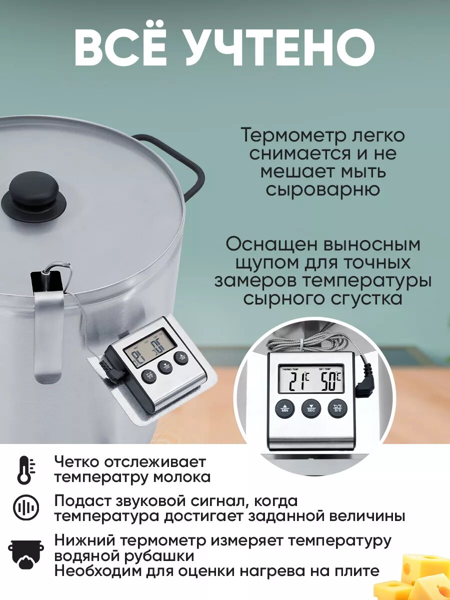 В комплекте электронный термометр, вставляется в гильзу и контролирует температуру воды в рубашке. К блоку автоматики подходит щуп, который с помощью клипсы опускается в молоко. Когда молоко нагреется до нужной температуры, блок подает звуковой сигнал.