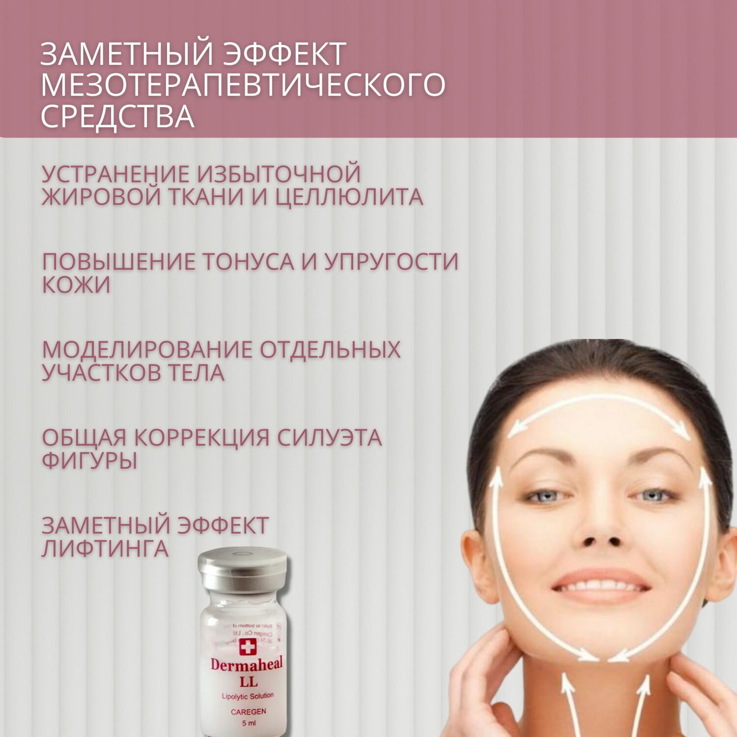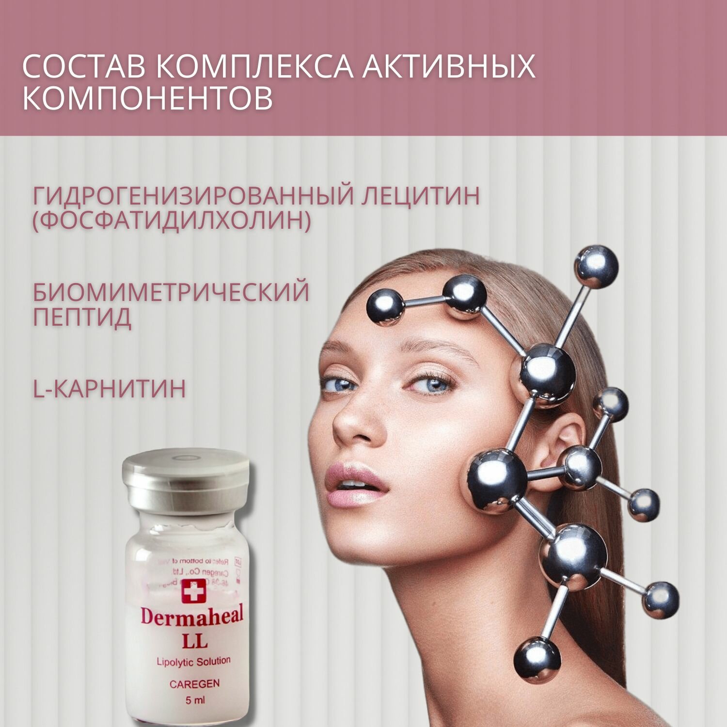 Мезококтейль Dermaheal LL (Lipolytic Solution) является смесью прямых и непрямых липолитических сывороток, а также пептидного комплекса. Дает быстрые и устойчивые результаты для уменьшения жировых складок. Dermaheal LL липолитический коктейль, который помогает организму растворить лишний жир и целлюлит. Нет риска эффекта йо-йо и боли — это то, что можно ожидать от лечения с помощью Dermaheal LL. Данный продукт, способствующий удалению жира, может разрушать жировые клетки в различных областях лица и тела. Эффект становится заметным через 4 недели после начала лечения, потому что одним из его действий является повышение выработки коллагена. Это делает его более эффективным, чем другие липолические сыворотки. Dermaheal LL обладает непрямым липолитическим действием, поэтому является препаратом выбора для физиологичной работы с жировой тканью. Decapeptide-4, входящий в препарат, стимулирует синтез коллагена в области коррекции, таким образом после уменьшения объема не возникает проблема «провисания» кожи. Decapeptide-4 (СG-IDP2) стимулирует синтез коллагена, способствует уплотнению кожи, препятствуя провисанию тканей после активной работы липолитических компонентов. Гидрированный лецитин (фосфатидилхолин) делает жир водорастворимым и более легко доступным для метаболизма и выведения в кровь. L-карнитин помогает вывести из клетки жирные кислоты и глицерин, образовавшиеся при липолизе.