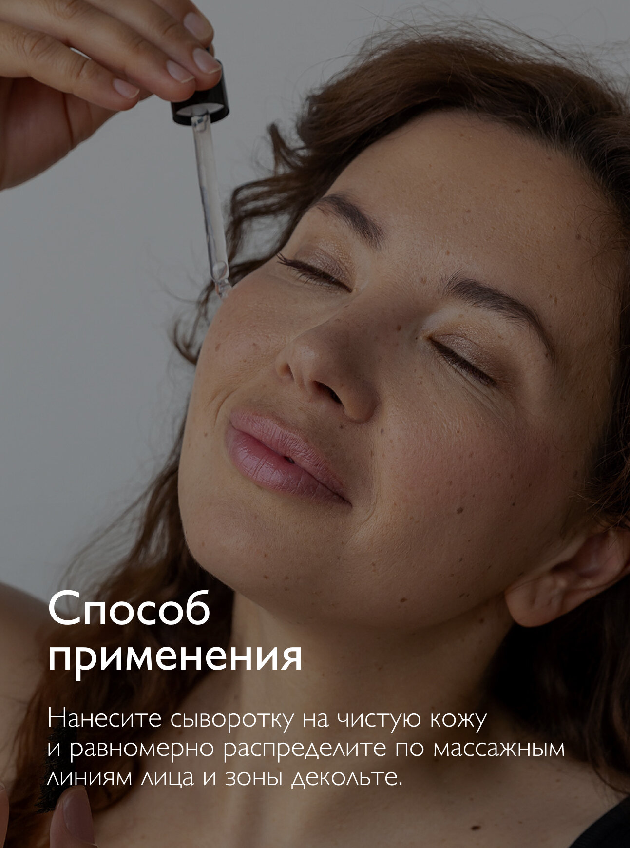 | Способ применения | нанесите сыворотку на чистую кожу и равномерно распределите по массажным линиям лица и зоны декольте. |