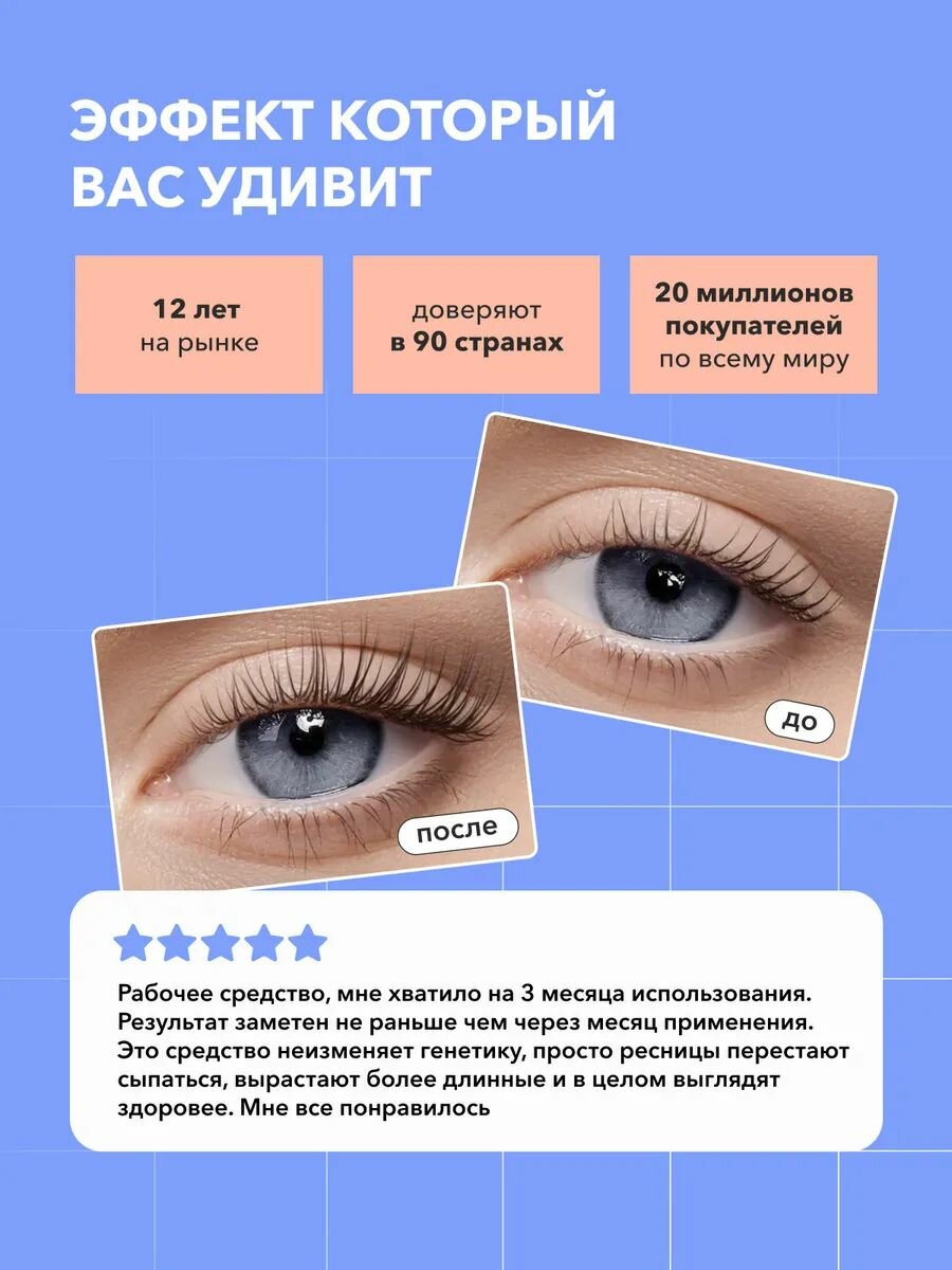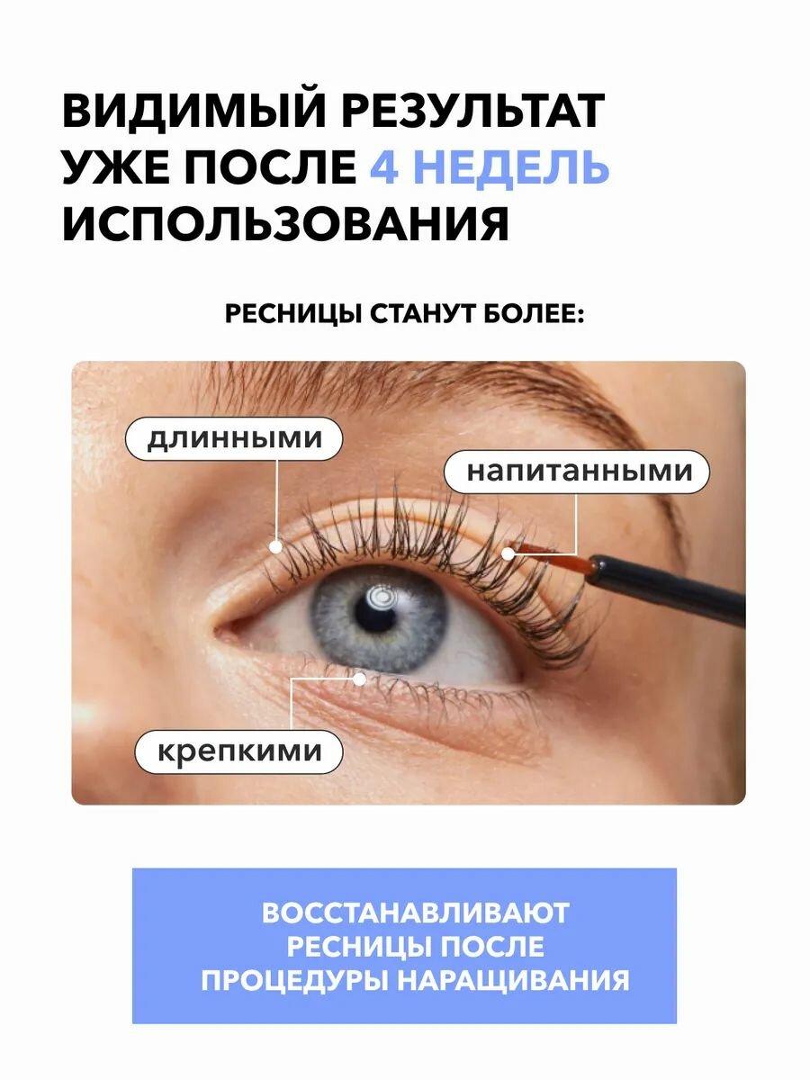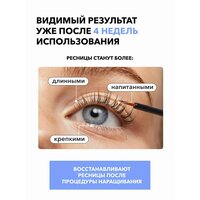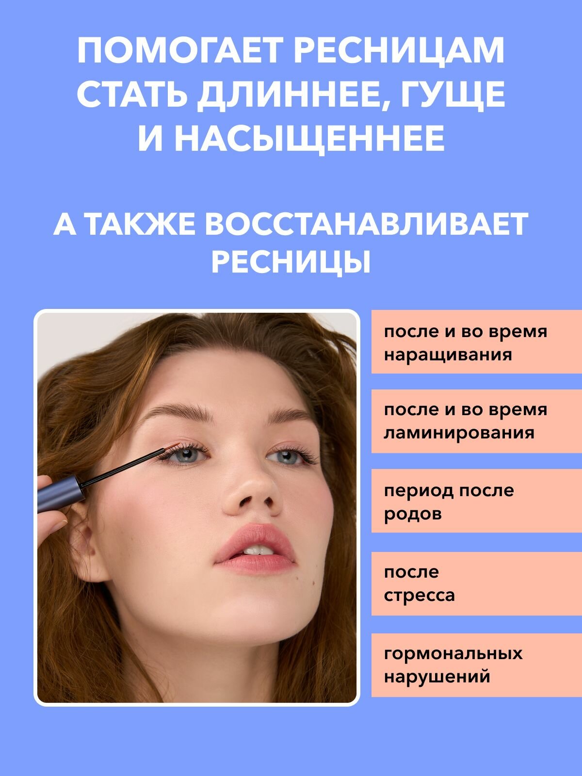 | Дополнительная информация | Без гормонов, протестировано офтальмологами и дерматологами, гарантия роста ресниц, научная разработка. Активные ингредиенты: биодоступный пептид, два вида гиалуроновой кислоты, витамин B5, комплекс аминокислот, Комплекс натуральных экстрактов: центеллы азиатской, горца, шлемника байкальского, камелии, розмарина и корня солодки |