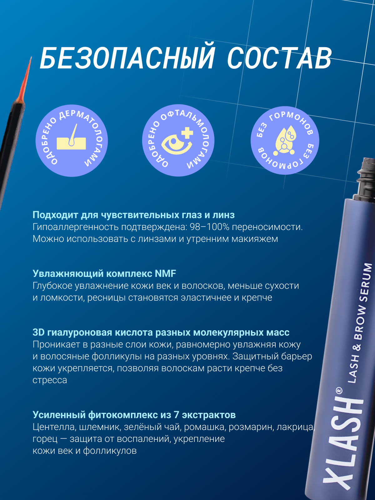 Сыворотка для роста ресниц и бровей Xlash Eyelash Serum 3,5 мл - это инновационный продукт, лидер продаж в России и Европе, разработанный английской лабораторией XLASH Cosmetics, средство для роста ресниц создано для ускорения естественного роста красивых и длинных ресниц. Икслаш - это средство для роста ресниц, которое помогает стимулировать рост ресниц, делая их более длинными, густыми и красивыми. Восстанавливает и активизирует рост ресниц , укрепляет, предотвращает их выпадение. Ресницы более густые и сильные! Работает в 3-х направлениях: Увеличивает длину; Увеличивает толщину и густоту ресниц; Делает ресницы более сильными; Она содержит уникальную комбинацию активных ингредиентов. Таких как пептиды - для пробуждения спящих фолликул и нормализации обменных процессов. Комплекс аминокислот - выполняют строительную функцию, восстанавливают поврежденную структуру волос, придают волосам прочность, блеск, гладкость и улучшают кровообращение в корне волоса. Два вида гиалуроновой кислоты для ухода за кожей век и обеспечения базу для роста ресниц. Комплекс натуральных экстрактов: центеллы азиатской, горца, шлемника байкальского, камелии, розмарина и корня солодки. В составе нет гормонов и других потенциально опасных для здоровья составляющих. Масло активатор для ресниц работает как незаменимый уход за ресницами и бровями. Икслаш прошло все необходимые дерматологические и офтальмологические тесты и имеет сертификаты качества в 36 странах мира. Сыворотка как и кондиционер для ресниц не вызывает дискомфорта – жжения, покраснения. Хлаш не оставляет неприятной липкости и комфортно для нанесения. Одним из главных преимуществ X lash является его удобный и простой способ применения. Достаточно наносить гель для роста ресниц на корни реснички каждый день перед сном, и она будет работать в течение ночи, позволяя вашим ресницам вырасти силой природы. Благодаря уникальной формуле активатор для роста ресниц 92% девушек отмечают наличие результата уже спустя 3 недели с начала использования. Согласно исследованиям, через 28 дней измеримые результаты составляют плюс 72% к длине, плюс 33% к объему! Полный курс – 3 месяца ежедневного нанесения масла для ресниц, после, для поддержания эффекта, рекомендуется использование дважды в неделю . Объем флакона средства для роста ресниц – 3 мл, этого количества хватает на 3 -4 месяца ежедневного использования, то есть на полный курс. В комплекте – линейка для измерения длины ресниц, чтобы вы могли самостоятельно оценить эффективность сыворотки. После достижения желаемого результата вы можете продолжать использовать сыворотку для поддержания и улучшения состояния своих ресниц как бальзам для ускорения и поддержания роста. В линейке XLASH Cosmetics вы найдете лучшие подарки для красоты и здоровья женщин. Подарок для женщины, подруги, мамы, девушки, жены на 8 марта, день рождения, новый год и любой праздник.