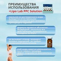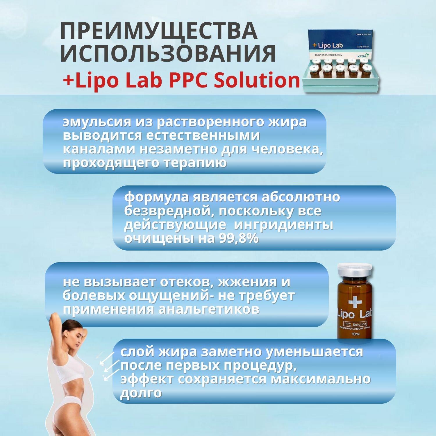 Липолитическая сывовортка прямого действия нового поколения для борьбы с жировыми отложениями. Быстро, эффективно, без восстановительного периода и без операционного вмешательства помогает избавиться от жира и целлюлита в области лица, груди, рук, ног, живота и ягодиц. За счет воздействия натуральных компонентов под названием фосфатидилхолин и дезоксихолат подкожный жир превращается в жидкую эмульсию и выводится из организма естественным путем. Препарат помогает вернуть красивую форму лица и тела, а также значительно улучшить состояние кожи. Если пациент не в восторге от своих форм и пастозности лица, пришло время исправить ситуацию, используя липолитик Lipo Lab PPC Solution. Препарат Lipo Lab PPC Solution представляет собой современный липолитик универсального действия. Косметологи активно используют этот препарат для устранения жировых запасов на определенных участках, которые проблематично скорректировать с помощью одних физических упражнений. Этот препарат способен исправить этот изъян внешности, а также решит ряд других проблем. Lipo Lab PPC Solution – популярный южнокорейский продукт для борьбы с лишним жиром. Компоненты, входящие в средство, положительно воздействуют на участки, расщепляя жировые депо, и гарантируют длительный эффект. Благодаря пролонгированному результату у пациента не возникает необходимость делать слишком часто повторный ввод препарата. дезоксихолат натрия обволакивает мембрану жировых клеток, которые под его воздействием разрыхляются, а фосфатидилхолин (PPC) превращает их в эмульсию, которая легко выводится из организма. Липолитическая сыворотка Lipo Lab PPC Solution эффективен против целлюлита, помогает в борьбе с локальными жировыми отложениями. Дает быстрый эффект липолиза. Повышает эластичность и тургор кожи, предотвращая появление морщин и провисание кожи. Дает эффективный пролонгированный результат. Может быть использован для моделирования контуров лица и тела