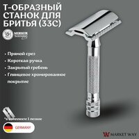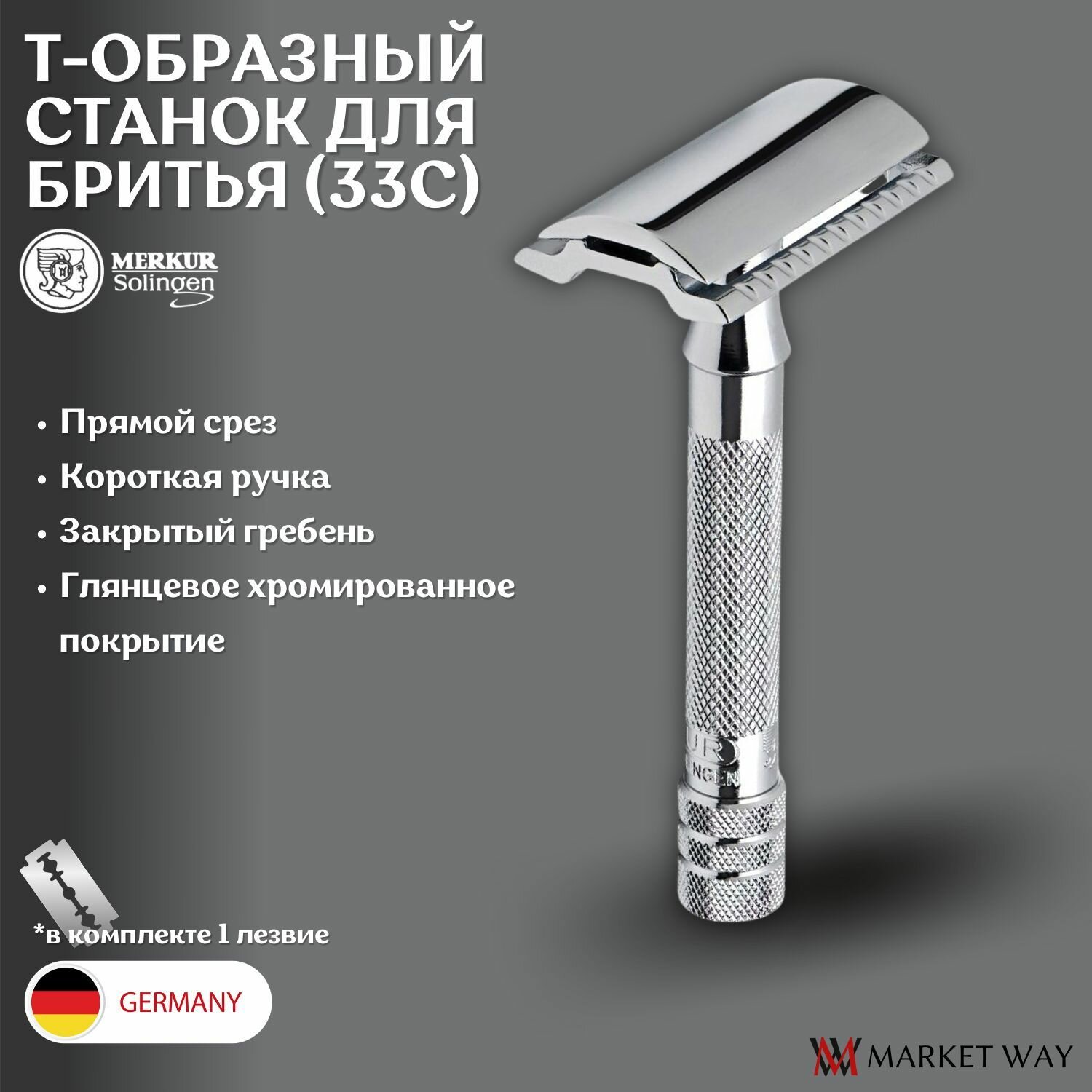 Станок для бритья Merkur Т-образной модели. Прямой срез, откручивающаяся ручка укороченная. Классический дизайн в традиции мастеров г. Золинген. В комплект входит одно высококачественное лезвие Меркур-платинум.