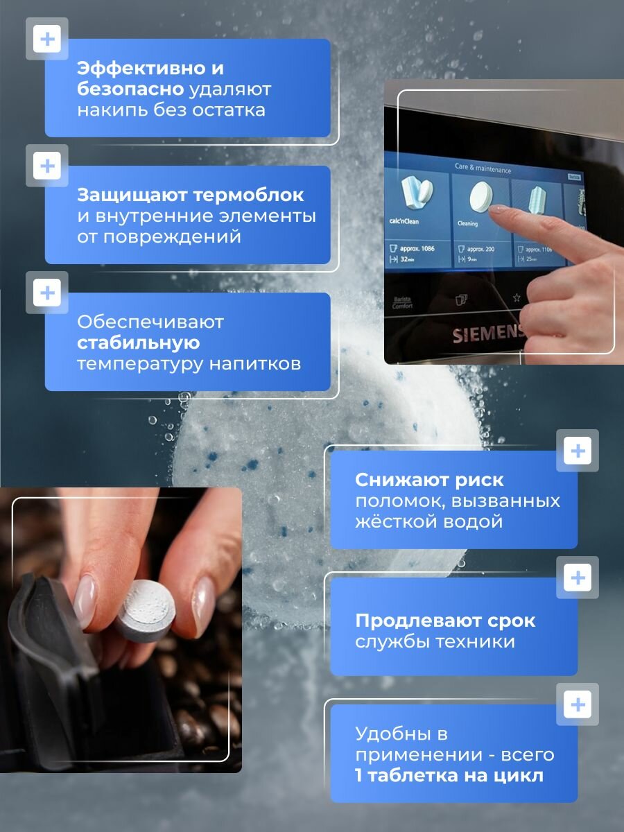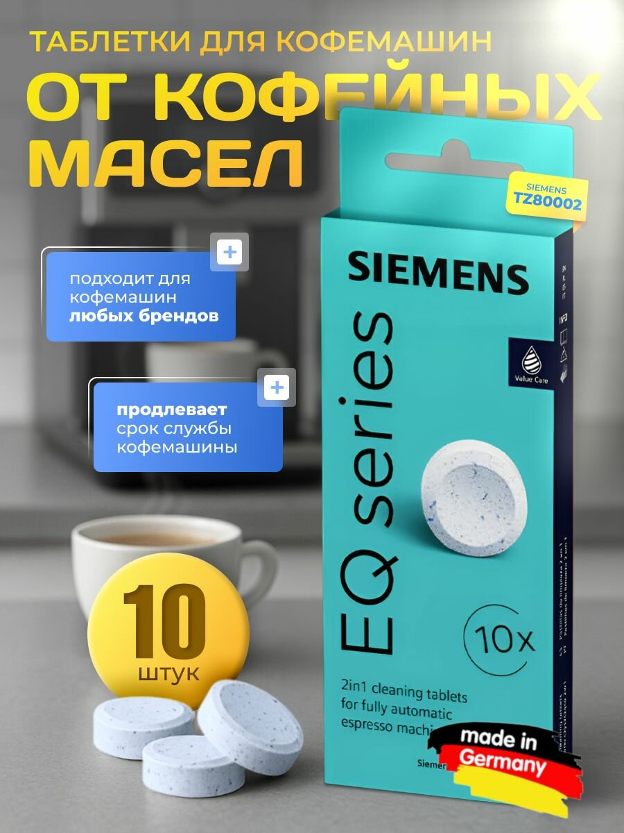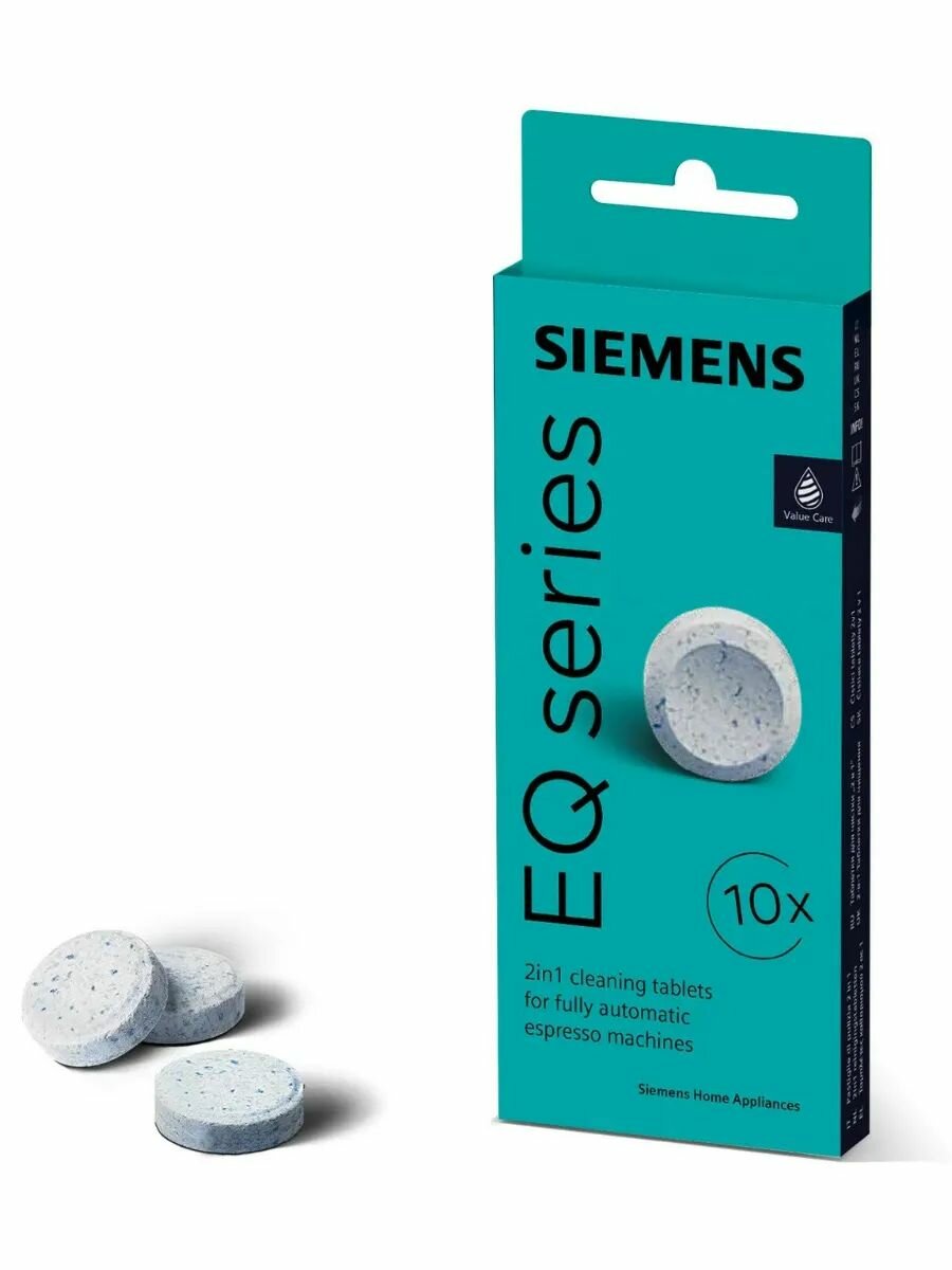 Чистящие таблетки для эспрессо-кофемашин Siemens. Благодаря регулярной очистке фильтрующего блока аромат кофе остается хорошим, а срок службы устройства значительно продлевается. Оптимизирован для программы очистки эспрессо/кофемашин. Подходит для всех отдельно стоящих и встроенных эспрессо/кофемашин Siemens. В комплекте: 10 чистящих таблеток.